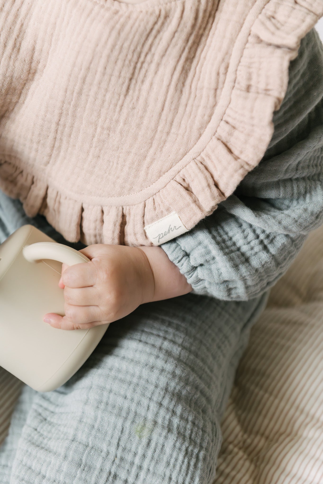Your go-to for feeding and teething. Crafted from GOTS certified 100% organic muslin, this soft and breathable bib features four absorbent layers to help keep your little one dry and comfortable. With an overlapping back panel and adjustable snap closure, it stays secure through every wiggle and mealtime moment. Finished with delicate ruffle trim for a sweet, elevated touch.