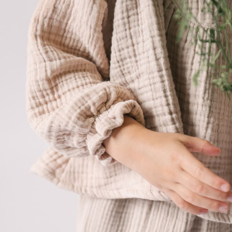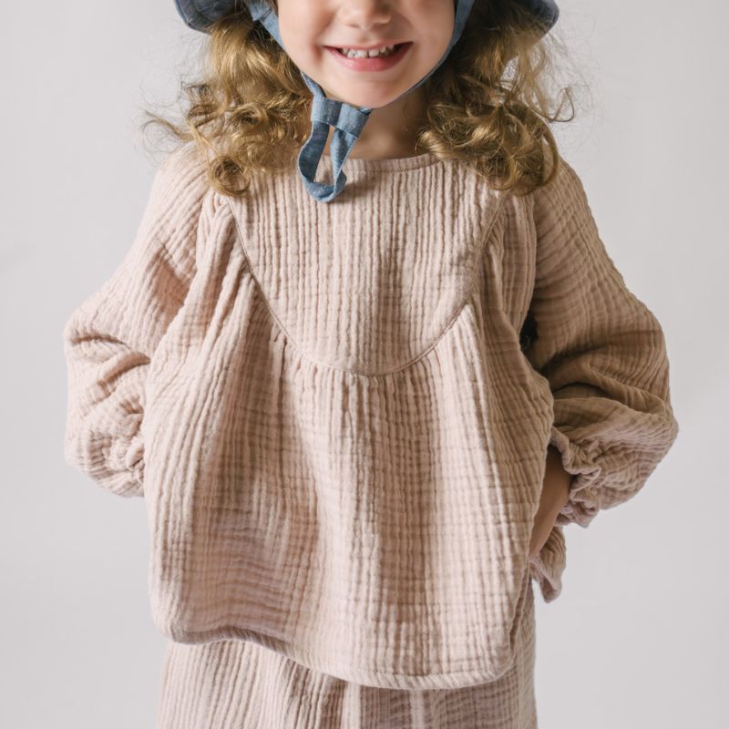 Made for twirling, playing, and everyday outfitting. This breathable toddler top is crafted from GOTS certified 100% organic muslin. Lightweight and naturally soft, it features raglan sleeves, elasticized cuffs, a back snap closure, and a flowy drape for all-day comfort. With a lived-in crinkled texture, it’s wrinkle-free and travel-friendly—perfect for dressing on the go. Pehr with our Muslin Pant for the sweetest matching set.