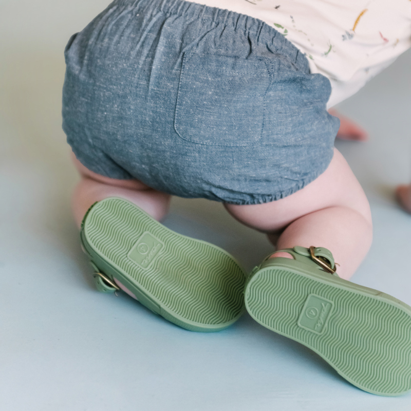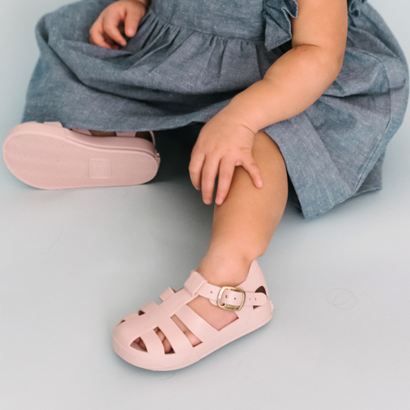 Water-ready, play-ready, and made for sunny days. From the beach to the backyard, the Fisherman Sandal is a warm-weather staple. Crafted from non-toxic, waterproof PVC with a removable cushioned in-sole, it’s flexible, durable, and easy to clean. A non-slip bottom helps support steady steps, while the adjustable strap with antique brass buckle ensures a secure fit. Finished with a soft matte texture and embossed logo, this sandal is as stylish as it is functional. Pehr with our Chambray Dress or Checkmate One-Piece for a head to toe look.
