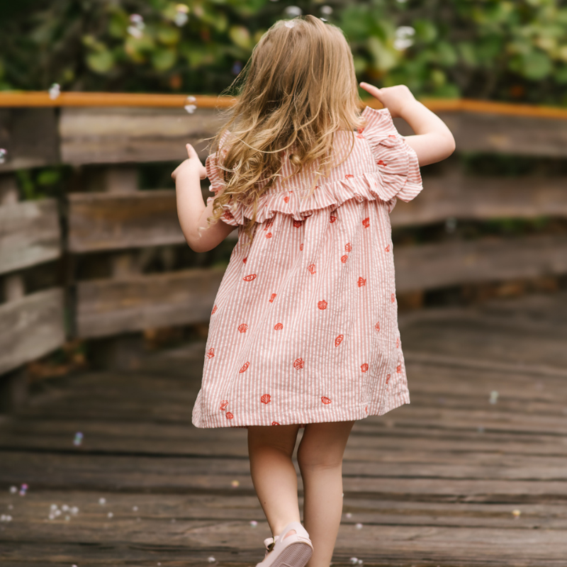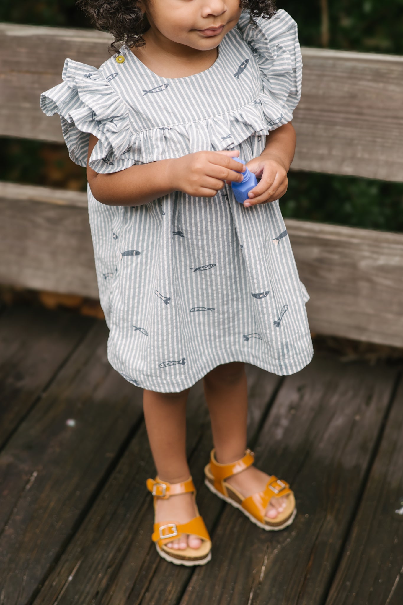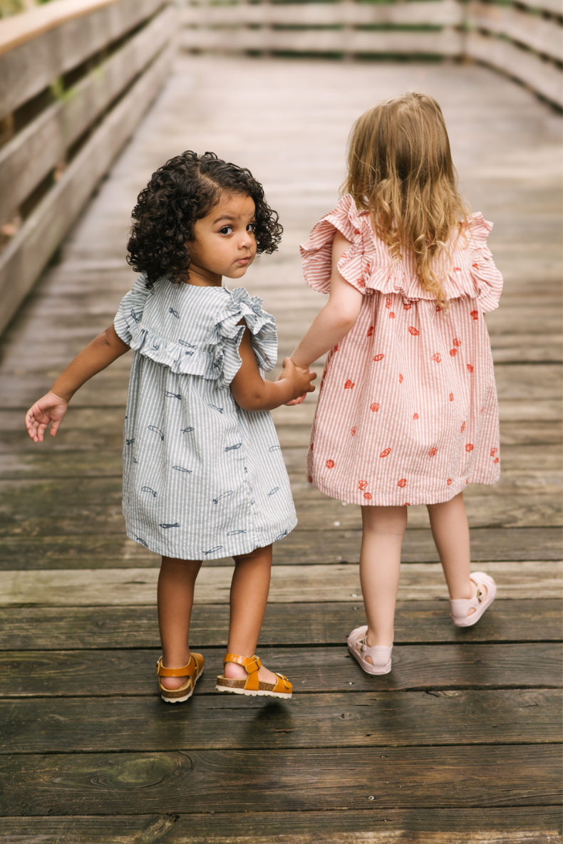 Inspired by classic nautical striped prints, this flutter-sleeve dress is finished with sweet ruffle details, a fully lined skirt for easy movement, and convenient shoulder button closures for effortless dressing. Thoughtfully designed for both style and practicality, it’s the perfect choice for summer celebrations, everyday play, and everything in between — effortlessly sweet, endlessly wearable.