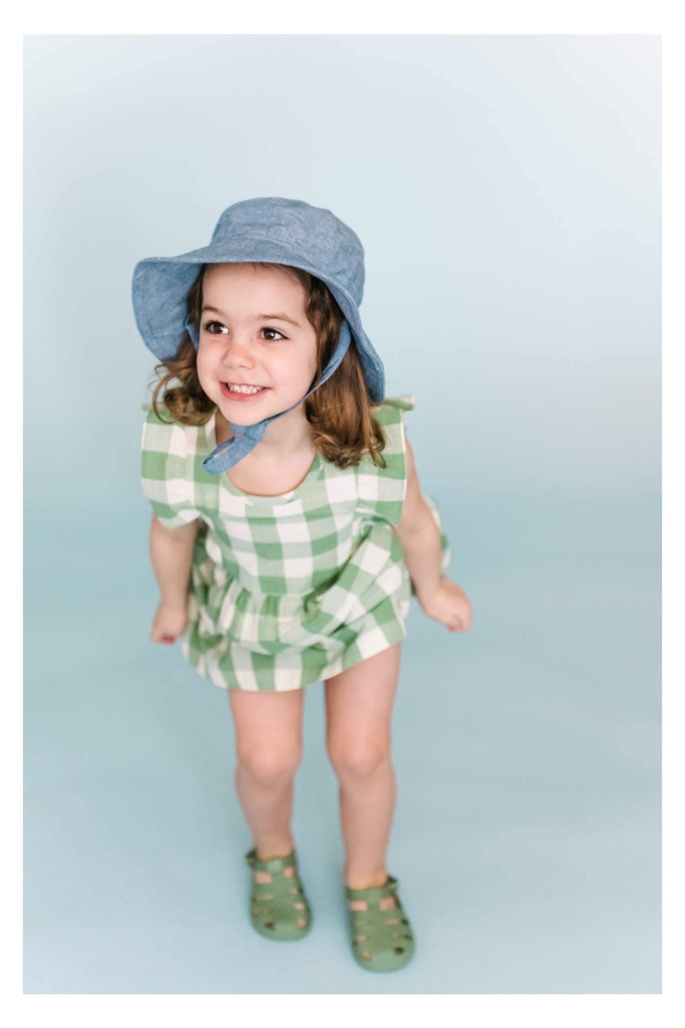 A summer must-have for sunny day adventures. Our Chambray Bucket Hat is made from GOTS certified 100% organic cotton chambray that's lightweight and breathable to keep little ones cool and comfortable. A wide brim offers added sun protection, while a soft elastic back ensures a snug fit that stays in place. Baby sizes (0m - 24m) include a chin strap for a secure fit, while toddler sizes (2T - 5T) are strap-free for easy on and off. Washed for added softness and designed to pair perfectly with our Chambray Short Romper or Chambray Dress.