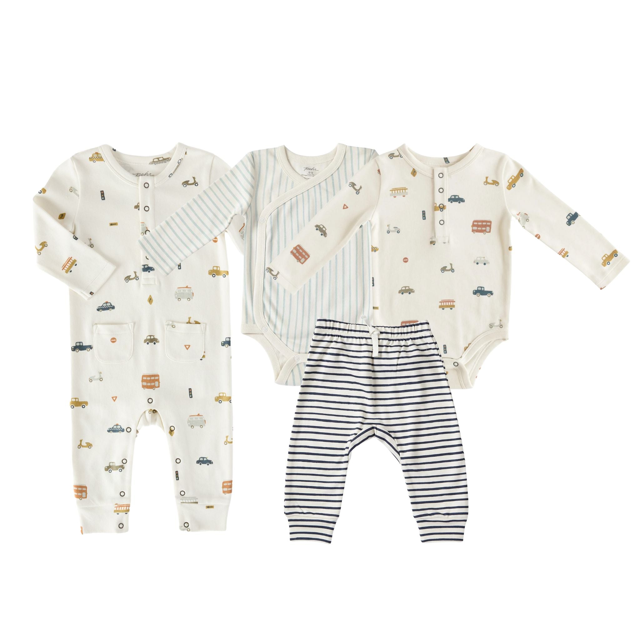 A baby outfit set for those precious first days. Perfect for newborn snuggles and everyday moments, the Brining Home Baby set includes four organic cotton baby essentials designed for softness, comfort, and easy diaper changes. Featuring a mix of our playful prints and classic striped styles, this baby clothing bundle is a must-have for your little one or a perfect baby shower gift.