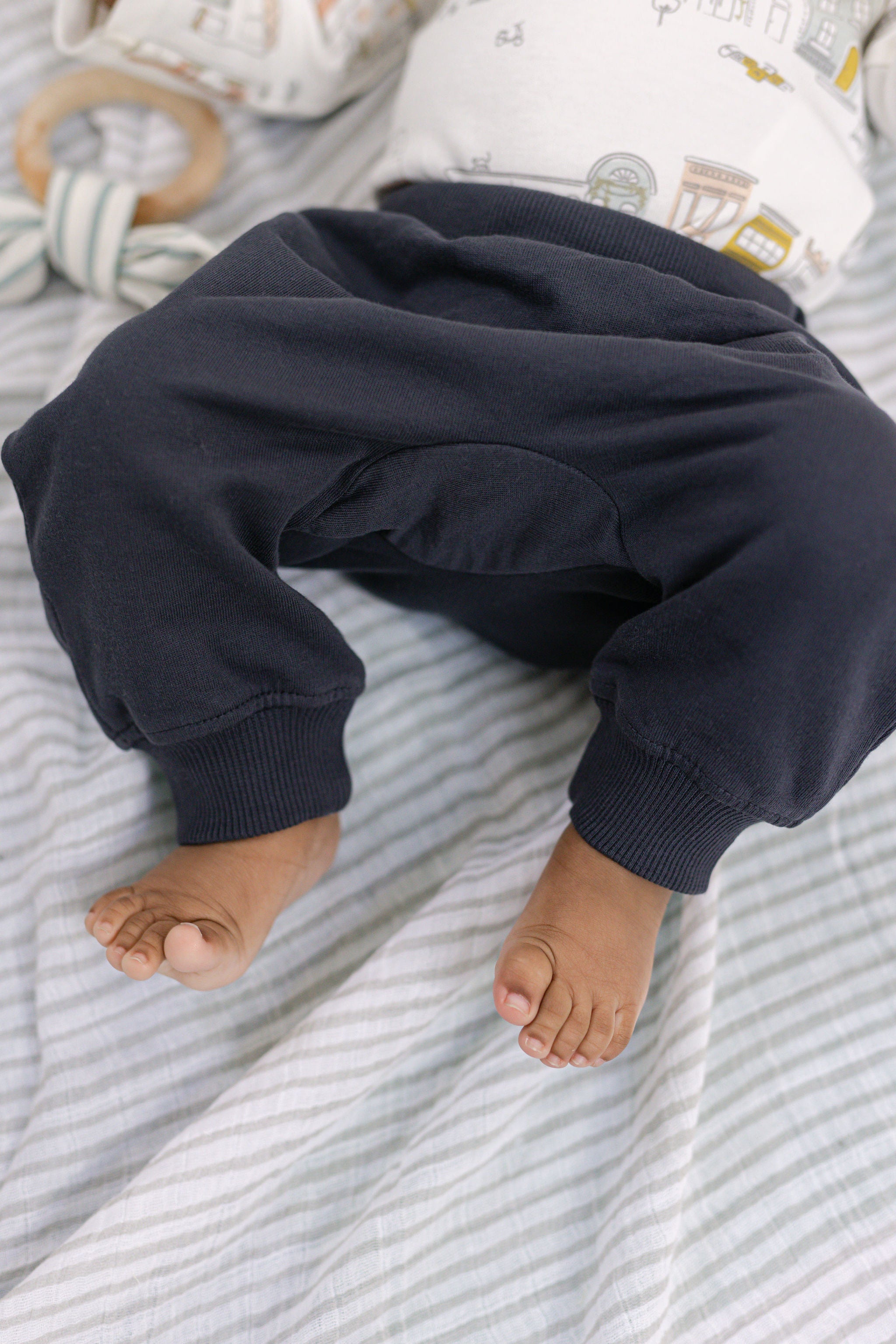Soft, cozy, and crafted from breathable GOTS-certified organic cotton French Terry, these matching sets make getting dressed easy. Designed with comfort and ease in mind, the pull-on harem pant features an elastic waist, while the top comes in a shoulder snap or ruffle style—depending on the color. Perfect for lounging at home or heading to a playdate, each outfit ‘Pehrs’ perfectly with our socks and booties for a complete look.