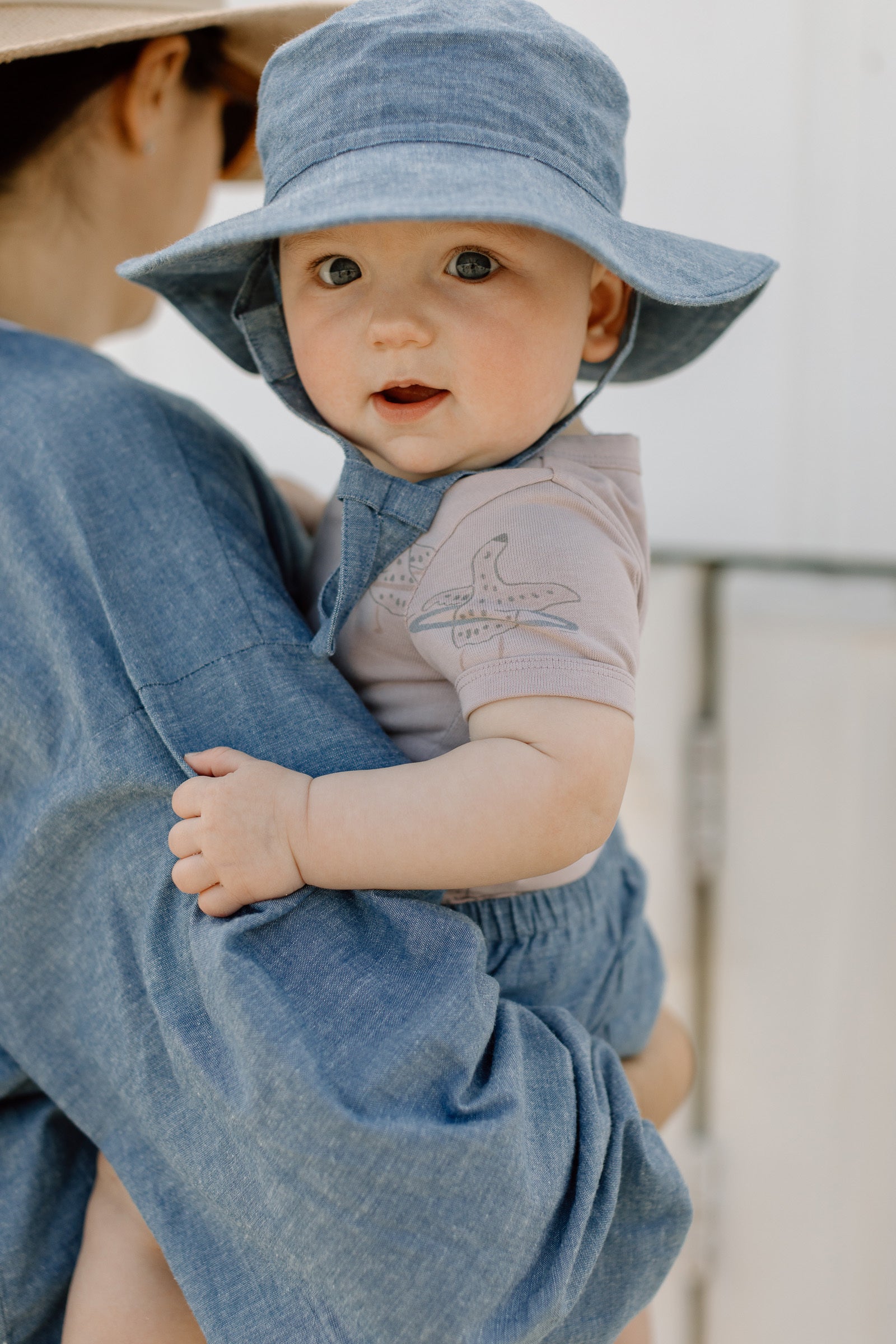 A summer must-have for sunny day adventures. Our Chambray Bucket Hat is made from GOTS certified 100% organic cotton chambray that's lightweight and breathable to keep little ones cool and comfortable. A wide brim offers added sun protection, while a soft elastic back ensures a snug fit that stays in place. Baby sizes (0m - 24m) include a chin strap for a secure fit, while toddler sizes (2T - 5T) are strap-free for easy on and off. Washed for added softness and designed to pair perfectly with our Chambray Short Romper or Chambray Dress.