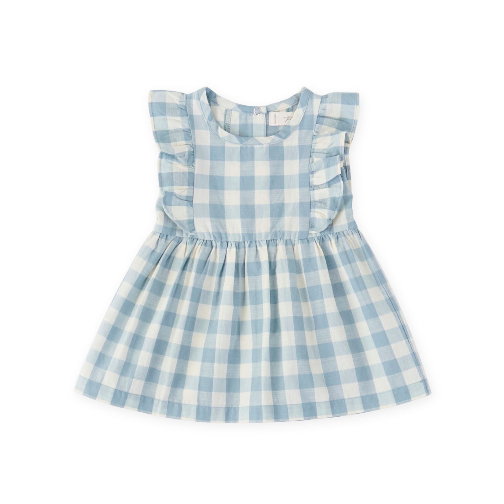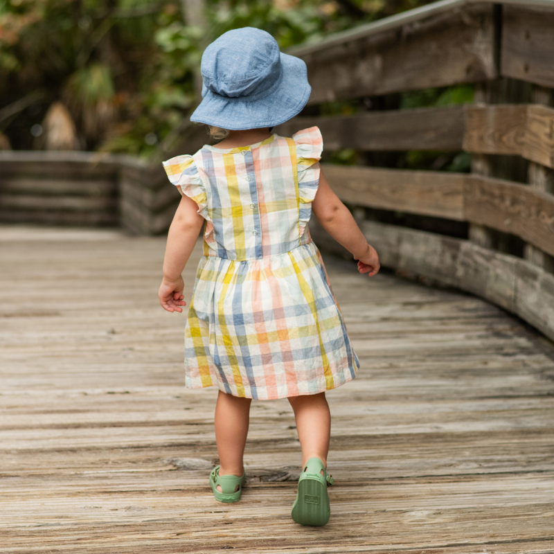 Our Checkmate Flutter Dress is made for those special moments, big or small. Crafted from GOTS certified 100% woven organic cotton, it features soft ruffle sleeves, delicate smocking, and a back snap opening for easy dressing. Complete the look and ‘Pehr’ with Sandals and a matching Bucket Hat, or Bloomers for baby sizes.