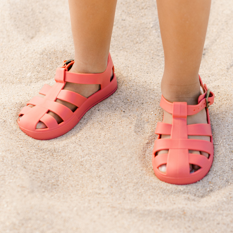 Water-ready, play-ready, and made for sunny days. From the beach to the backyard, the Fisherman Sandal is a warm-weather staple. Crafted from non-toxic, waterproof PVC with a removable cushioned in-sole, it’s flexible, durable, and easy to clean. A non-slip bottom helps support steady steps, while the adjustable strap with antique brass buckle ensures a secure fit. Finished with a soft matte texture and embossed logo, this sandal is as stylish as it is functional. Pehr with our Chambray Dress or Checkmate One-Piece for a head to toe look.