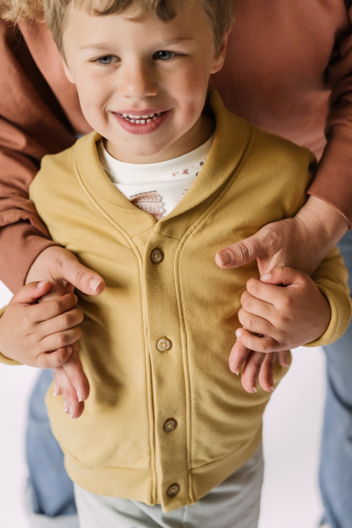 A cozy classic made for layering. Crafted from GOTS certified 100% organic French Terry cotton and garment dyed for a vintage-inspired finish, our French Terry Cardigan is the soft staple you’ll reach for again and again. Thoughtful details like rolled-back cuffs for a grow-with-me fit, hidden side pockets for tiny treasures, and faux horn buttons make it as practical as it is adorable. Pehr it with our French Terry Harem Pant for a comfy, coordinated look.