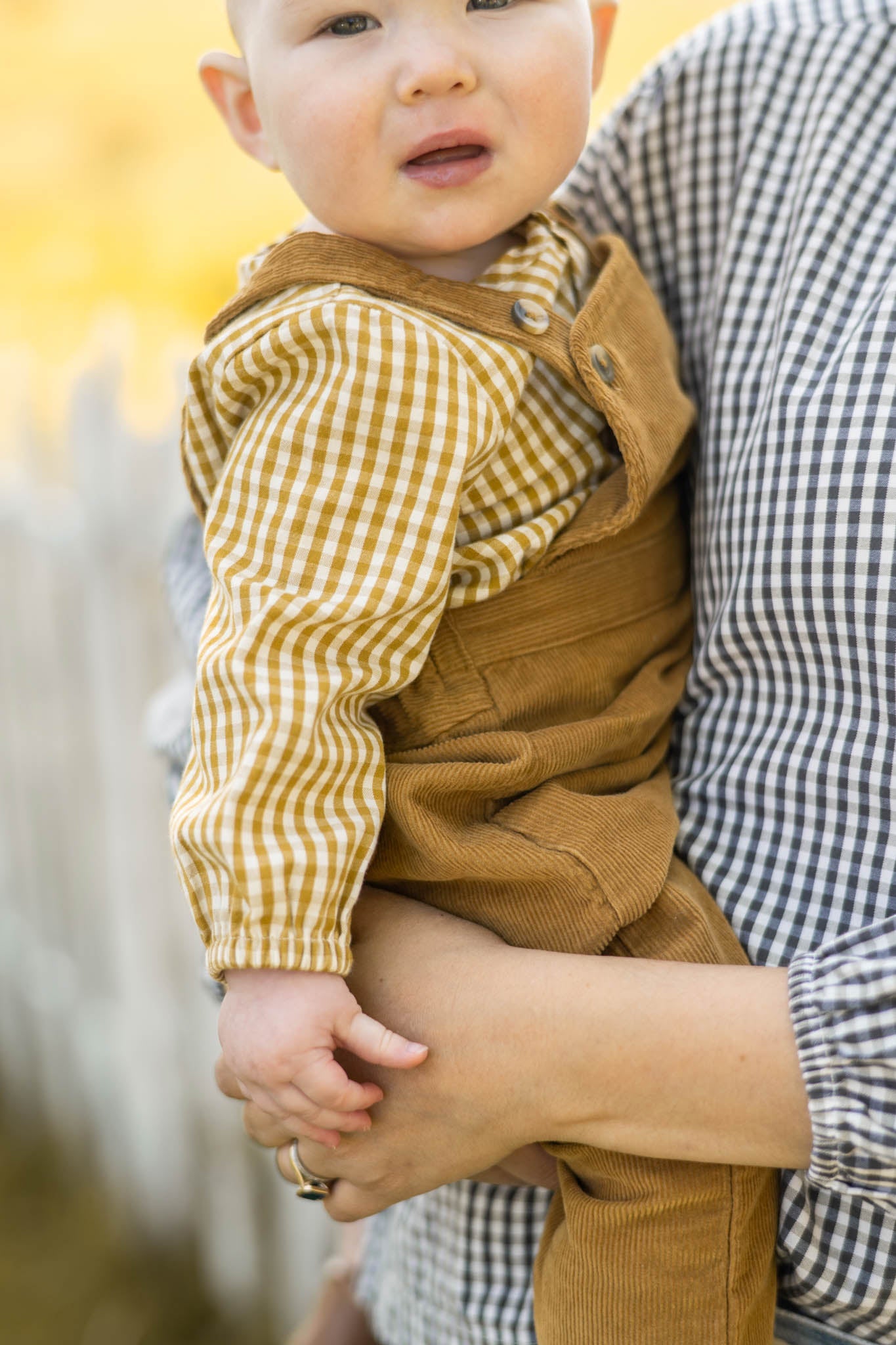 Perfect for special moments, big and small. Our Gingham Long Sleeve One-Piece is crafted from GOTS-certified 100% organic cotton in a timeless, stone-washed woven check. With a Henley snap placket, front patch pocket, and elasticized cuffs, it blends classic style with everyday comfort. Snaps at the bottom make changes quick and easy, while the soft, breathable fabric keeps your little one comfy through every adventure. Pehr with our Denim Pull-Up Jeans or Denim Overall for a picture-perfect look.