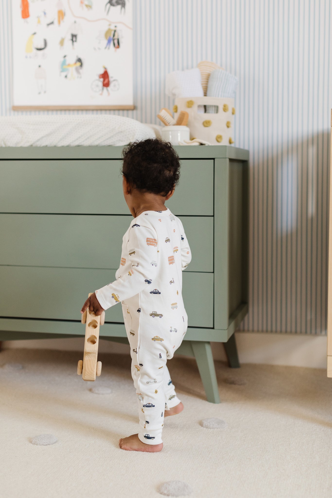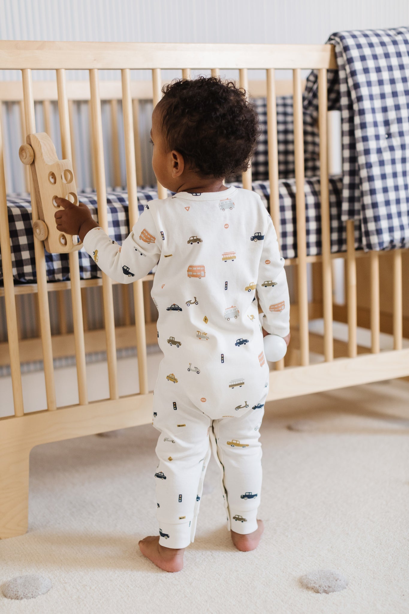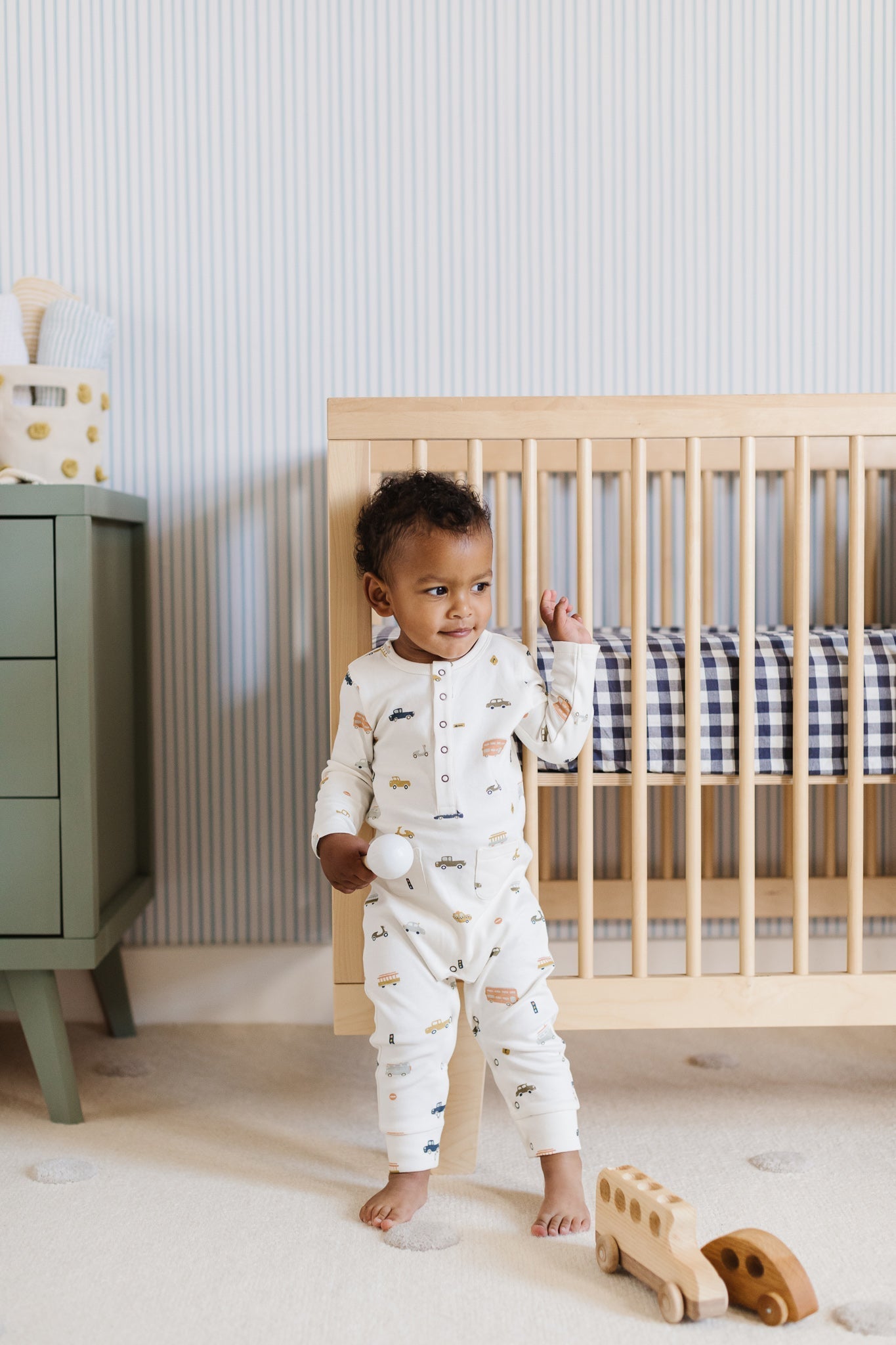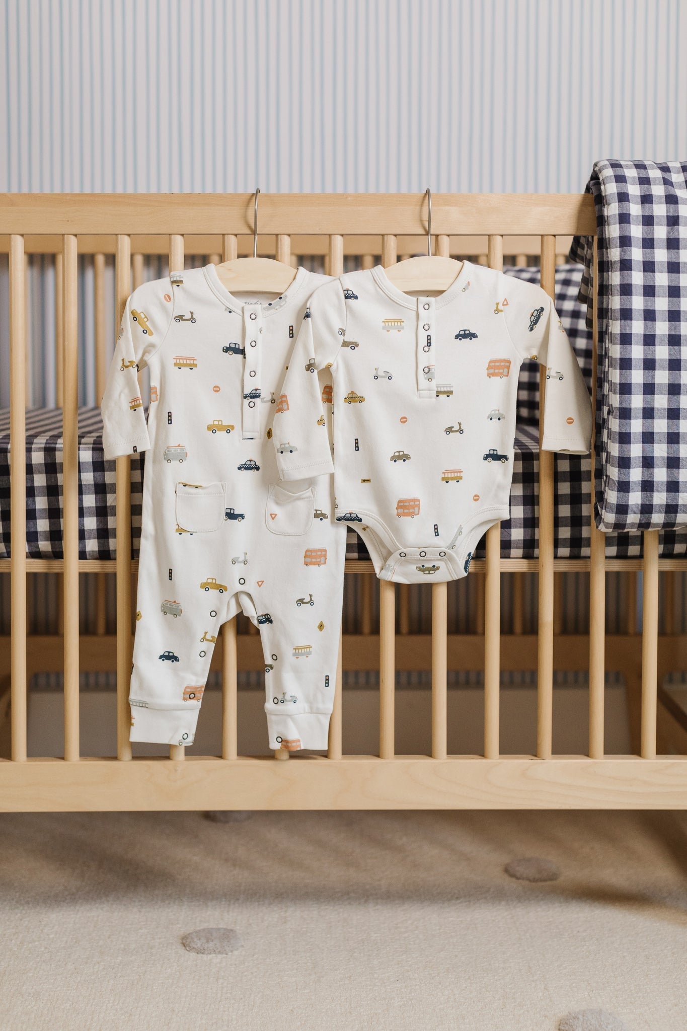 A cozy favorite, make to love and live in! Crafted from our softest GOTs certified organic cotton, the Henley Patch Pocket Romper is designed with brass snaps along the front and legs for easy changes. Two handy patch pockets add a playful touch—perfect for tiny treasures. Available in our bestselling prints that bring every detail to life. Pehr with booties to complete the look.