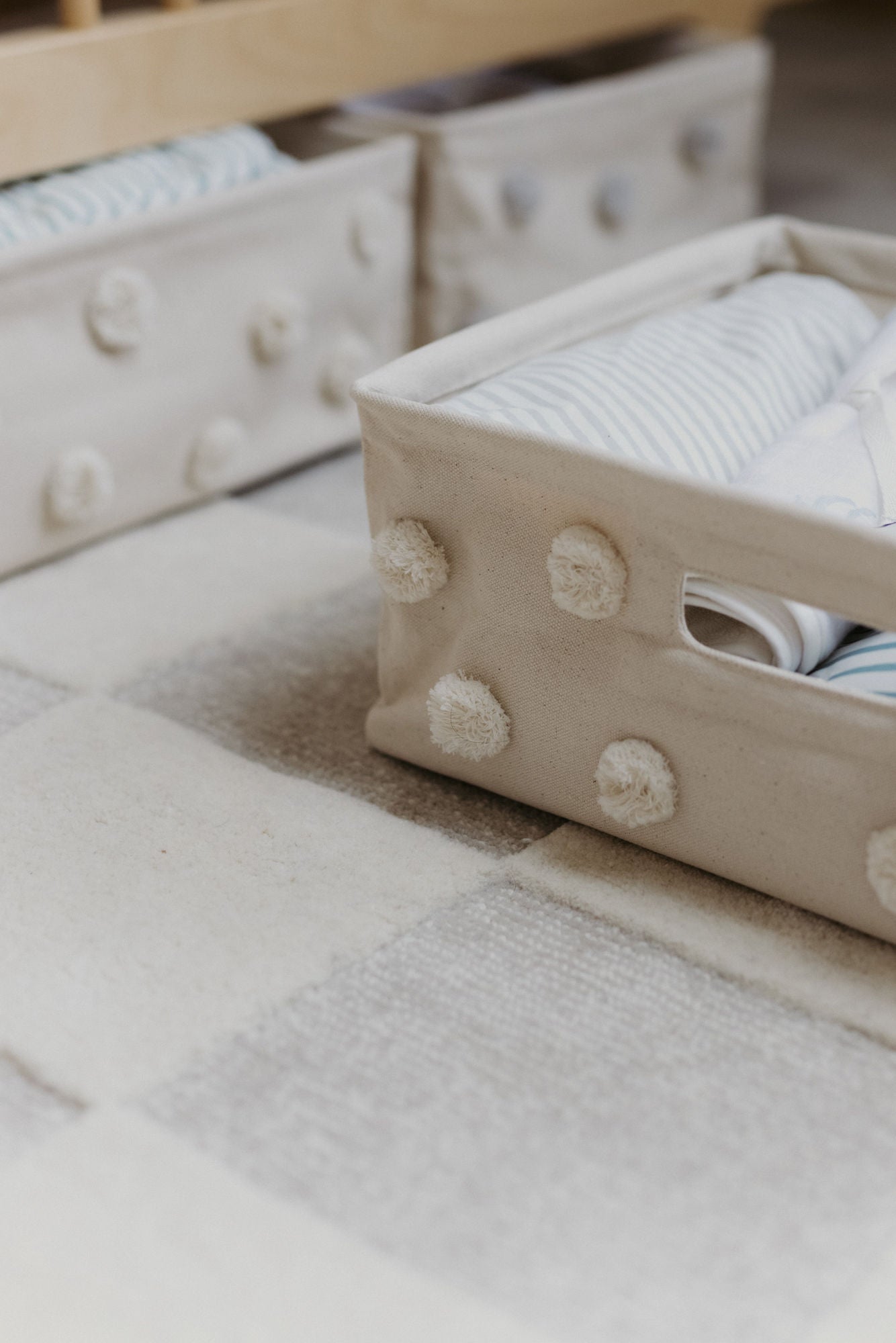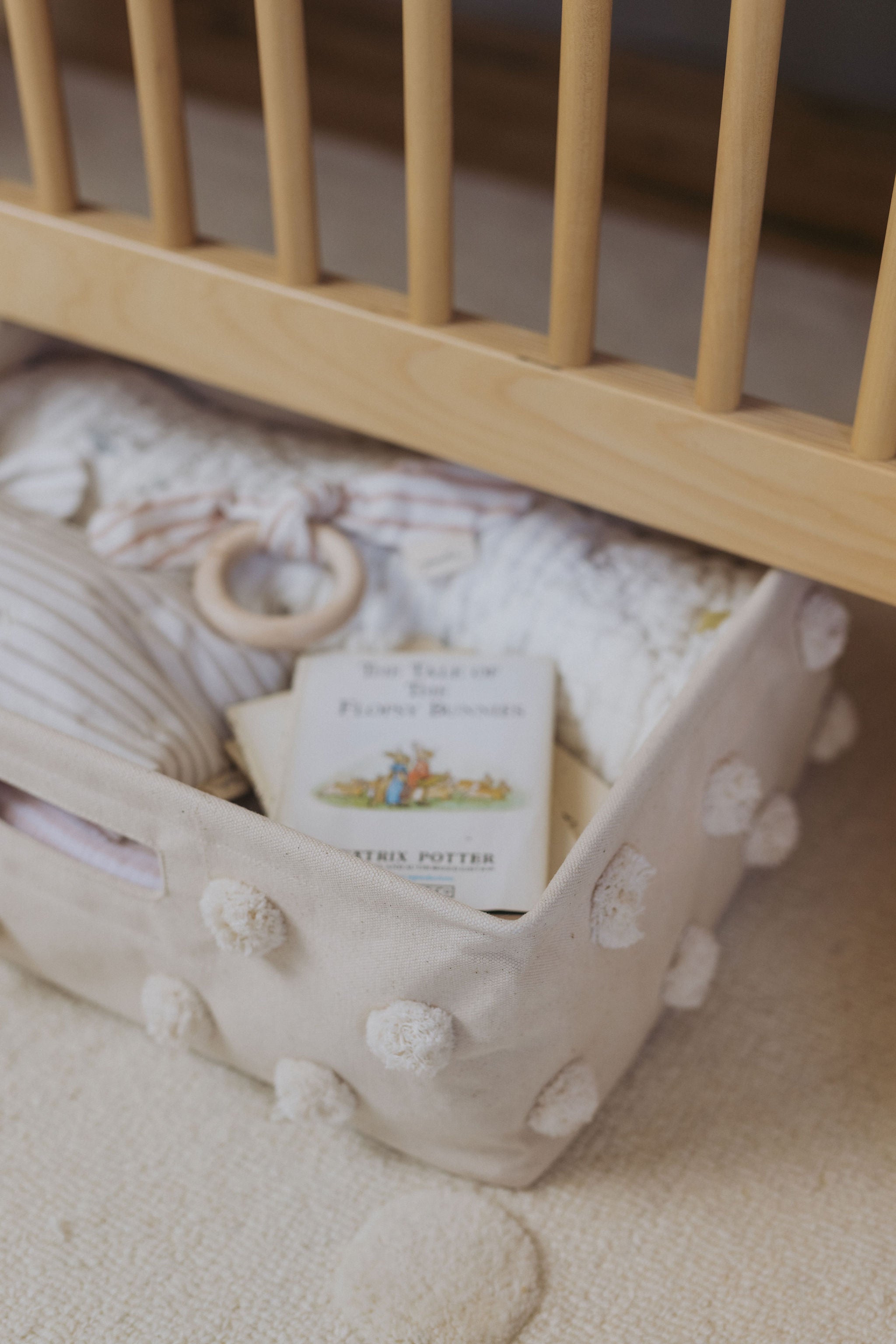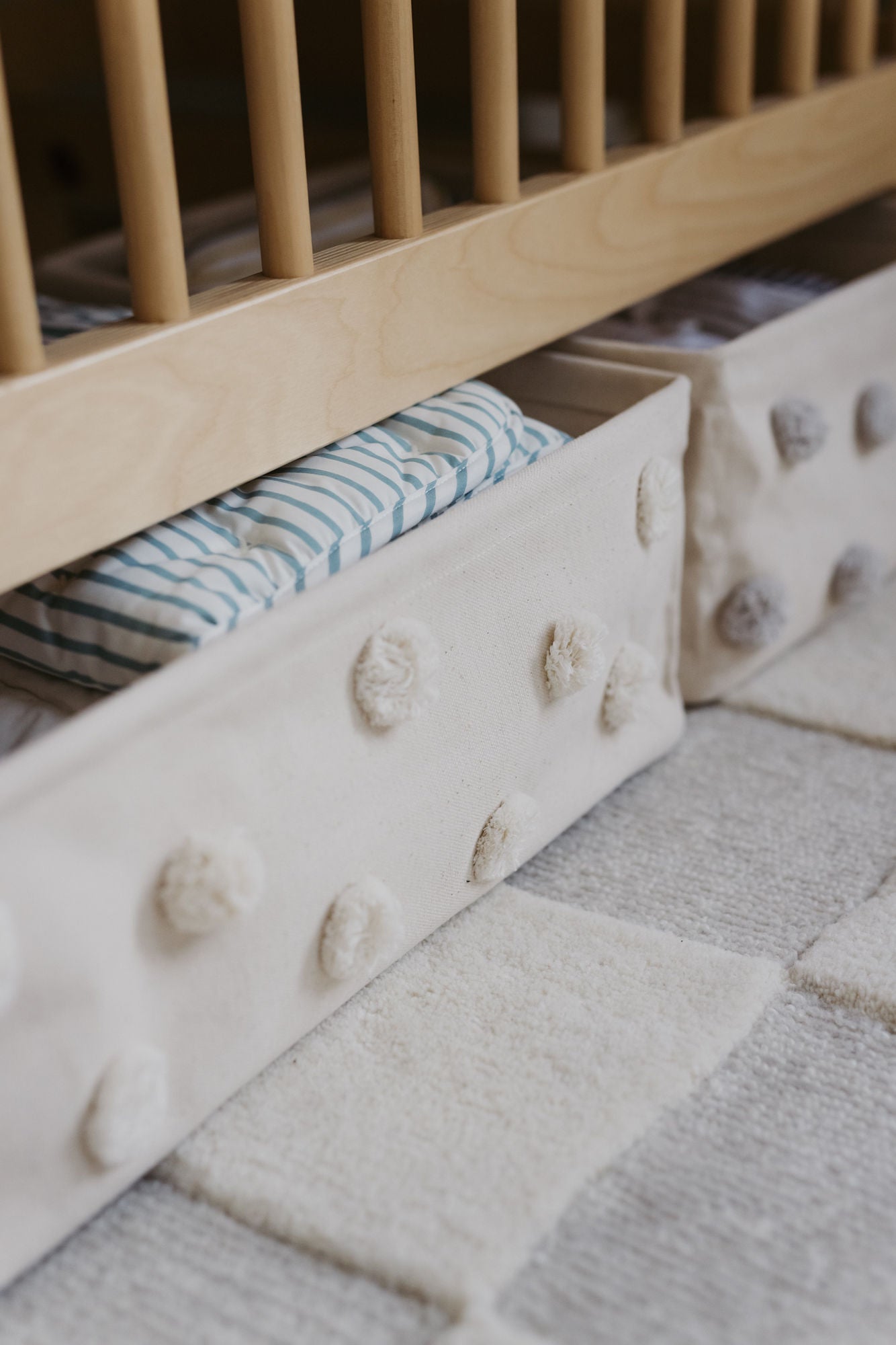 Embrace your unused space with Hideaway Storage, the newest addition to our Pom Pom family! The two sizes nest together and fit perfectly under a crib or bed, made of durable cotton canvas with 3 colors to choose from. The top rim is also wired with handles, so they're sturdy and easy to move.