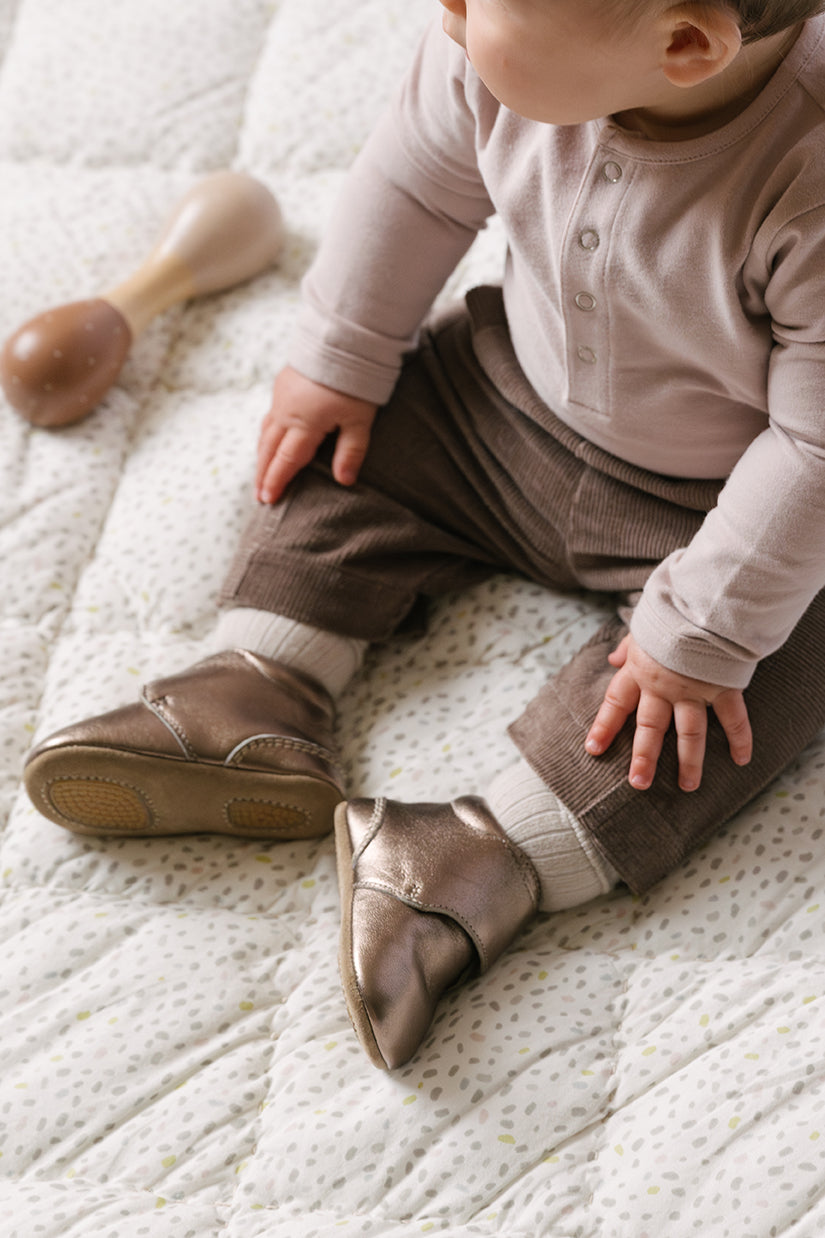 The perfect first walker, with a little extra shimmer. Designed with early steps in mind, our Metallic Babble Bootie is crafted from a soft blend of suede and metallic leather with a flexible sole and anti-slip grippers to support little movers. A wide toe box and easy Velcro closure make them simple to slip on and off—whether you're dressing up or heading out to play. Pehr with our Essentials Leggings and Pointelle Knit Sweater for a cozy, coordinated look.