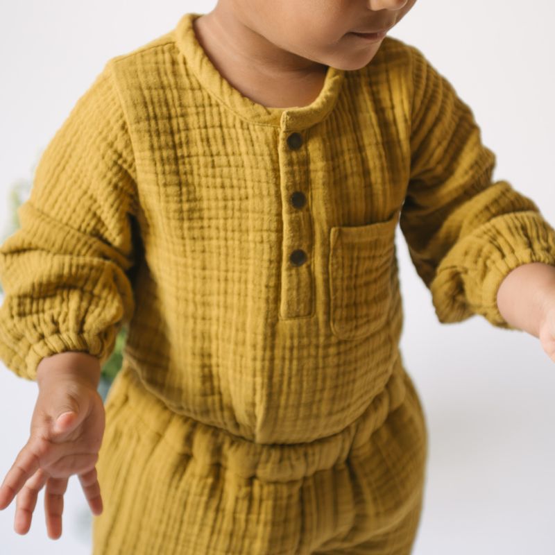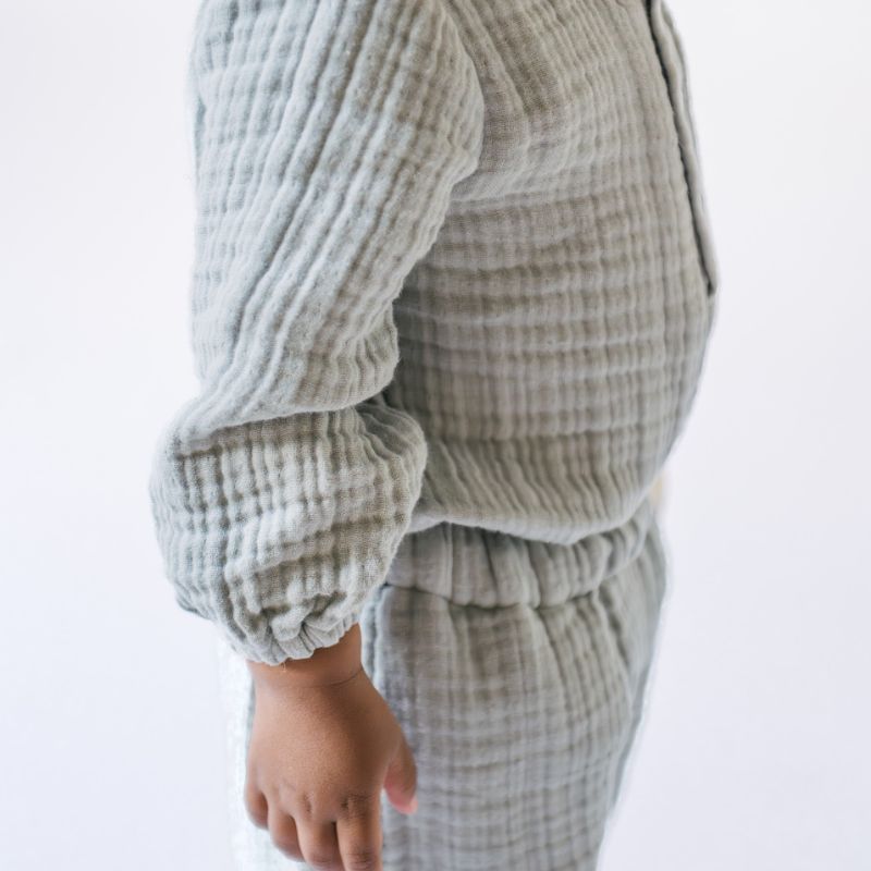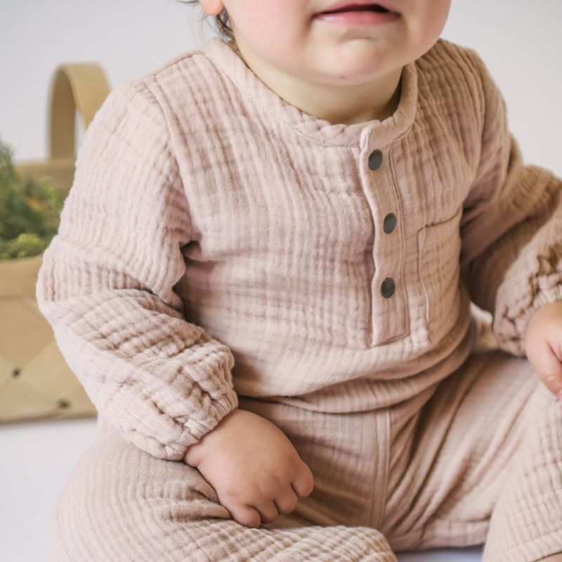 Made for easy days and cozy play. This long sleeve baby one-piece is crafted from GOTS certified 100% organic 4-layer muslin that’s ultra soft and breathable. With a henley snap neckline, elasticized cuffs and leg openings, and a bottom snap closure, it’s designed for quick changes and all-day comfort. The crinkled finish means no ironing needed—just easy, everyday dressing. Pehr with our Bucket Hat for sunny day adventures.