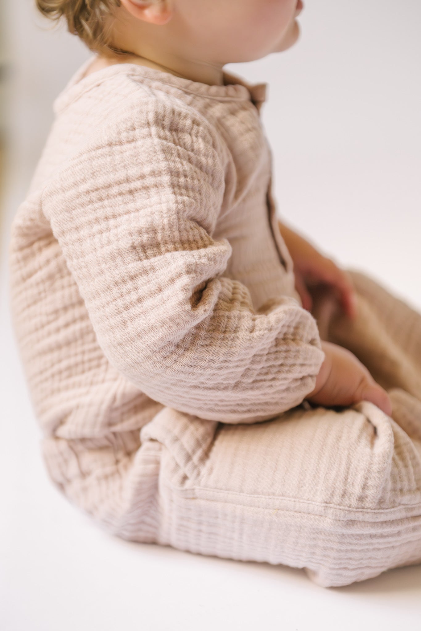 Made for easy days and cozy play. This long sleeve baby one-piece is crafted from GOTS certified 100% organic 4-layer muslin that’s ultra soft and breathable. With a henley snap neckline, elasticized cuffs and leg openings, and a bottom snap closure, it’s designed for quick changes and all-day comfort. The crinkled finish means no ironing needed—just easy, everyday dressing. Pehr with our Bucket Hat for sunny day adventures.