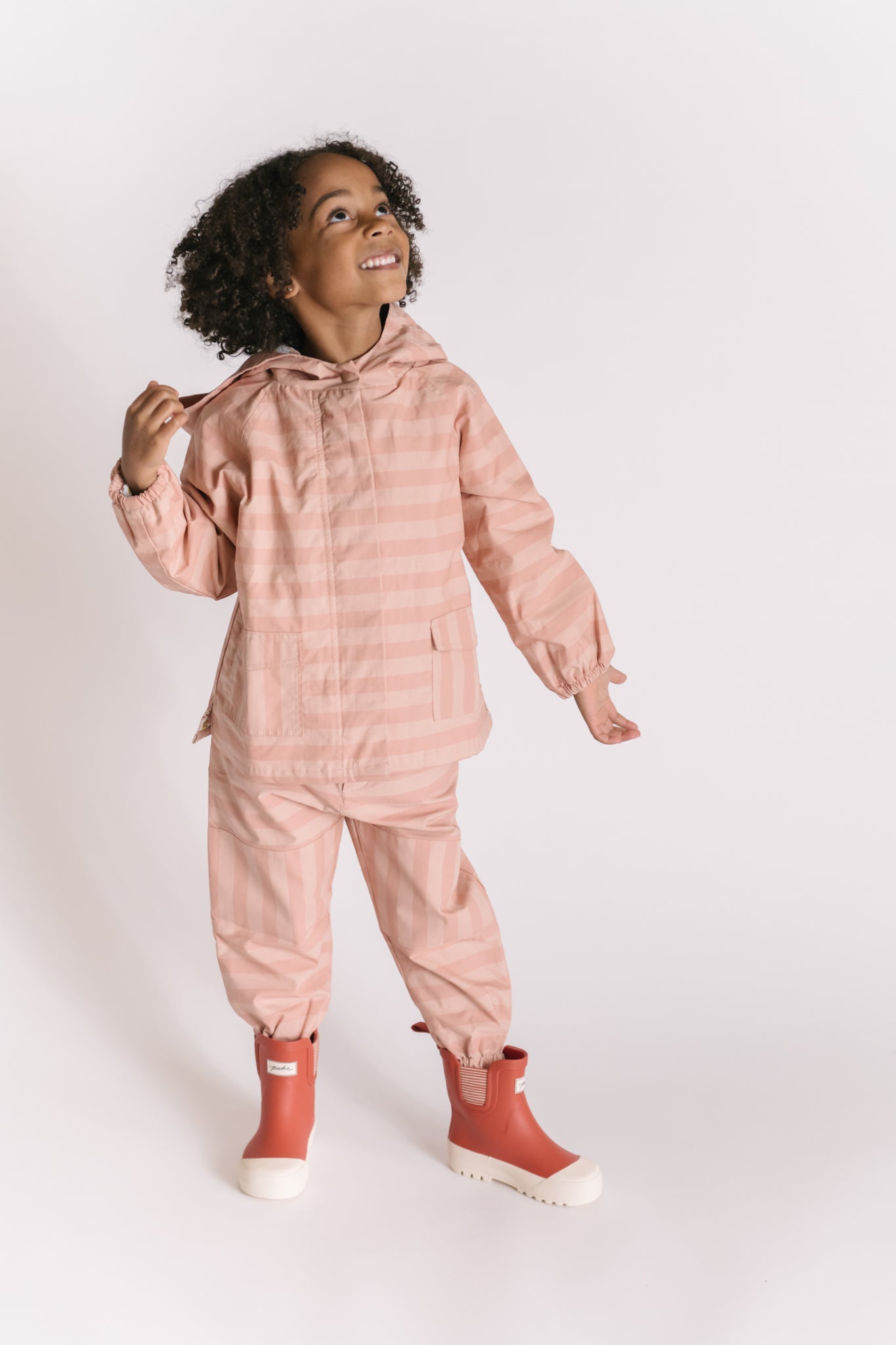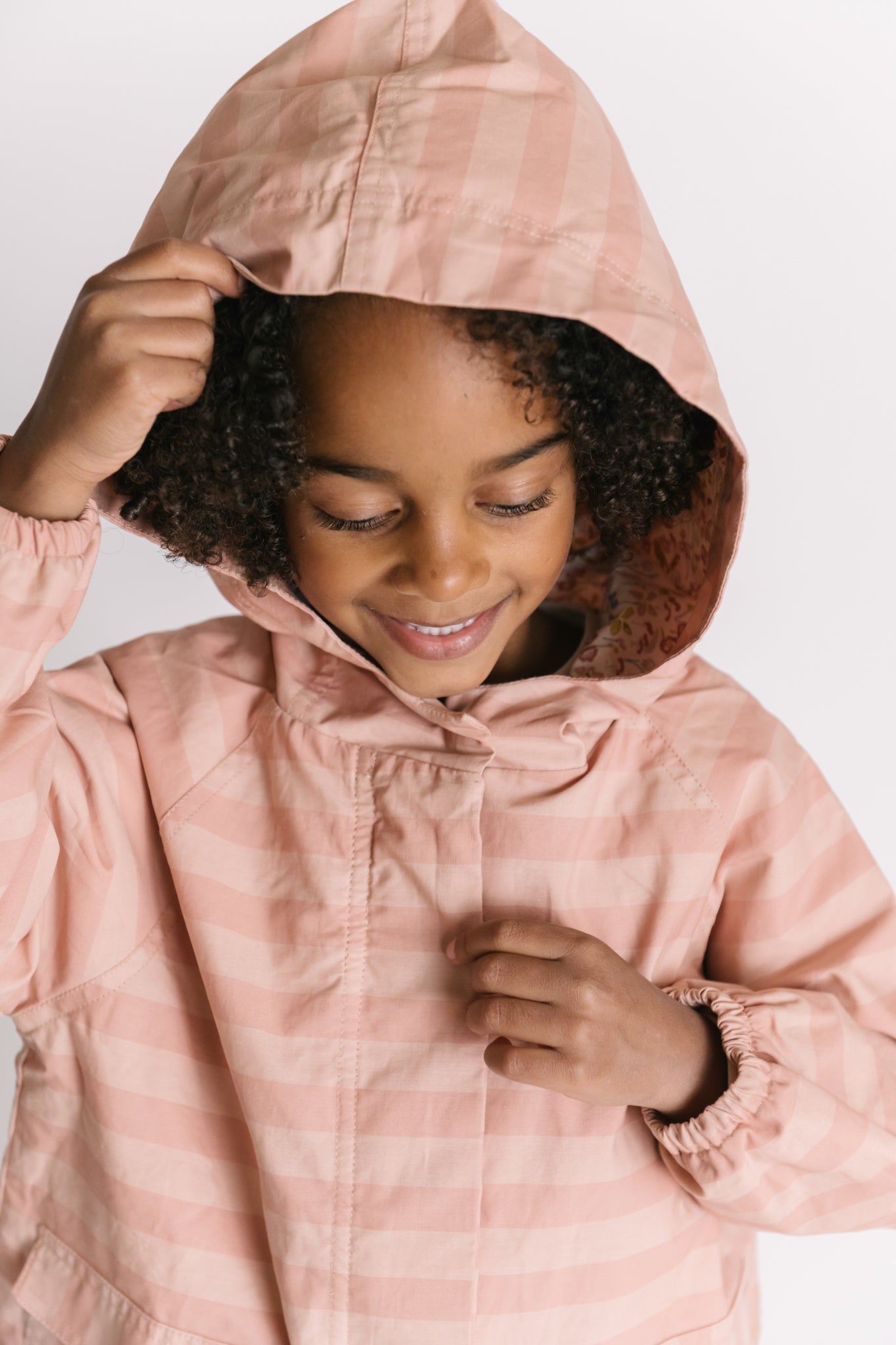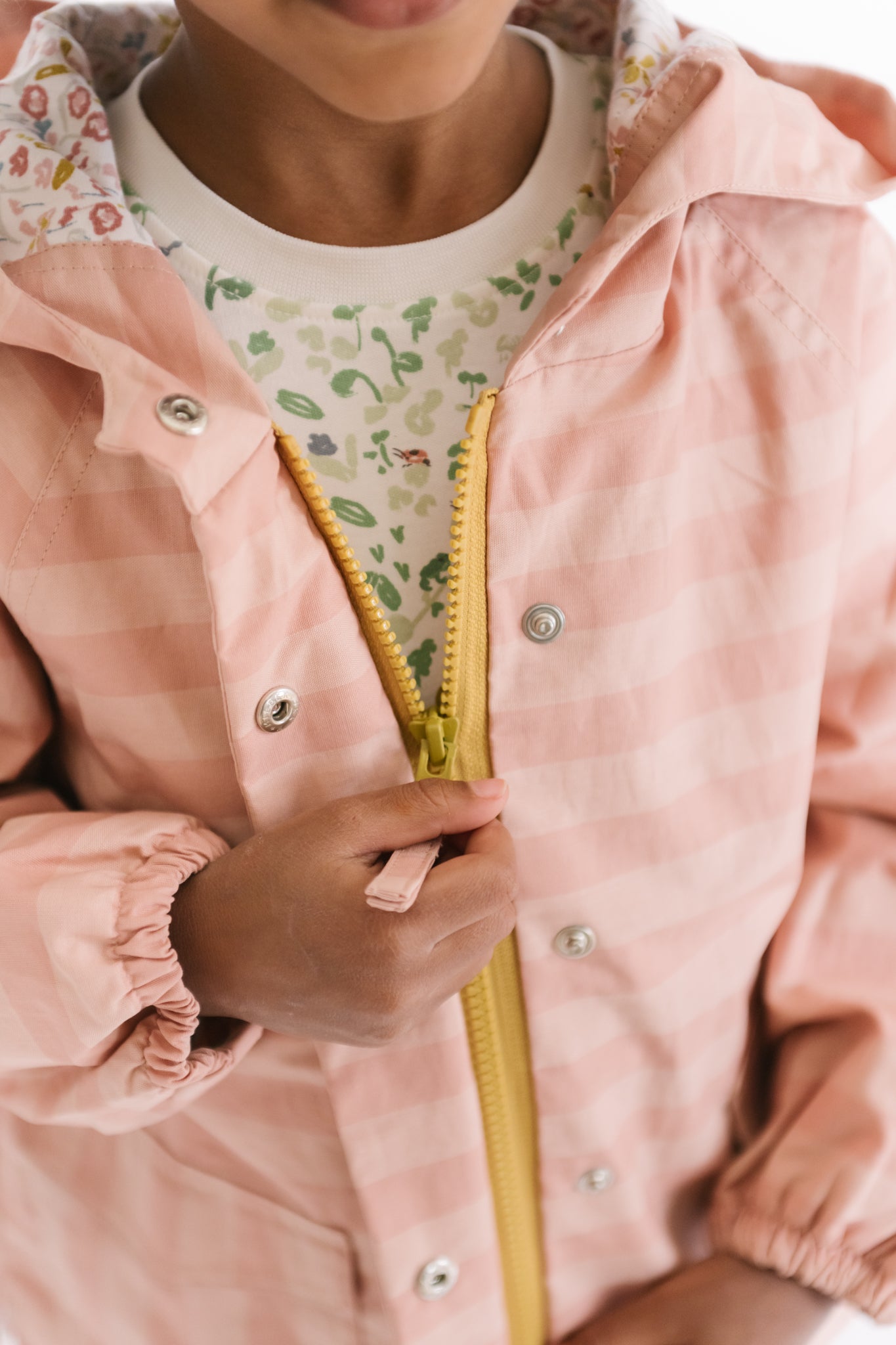 Designed for adventures, this Toddler Rain Jacket is made to layer up and get outside, rain or shine. The perfect Rain Gear for Toddlers, this jacket is available in three timeless colors, and features a non-toxic, water-repellent coating, elastic cuffs and an oversized hood to keep them dry. The jacket is easy to take off for quick changes with an additional zipper puller. Inside the jacket, you will discover an 100% organic cotton chambray lining, along with an interior name label for busy school days.