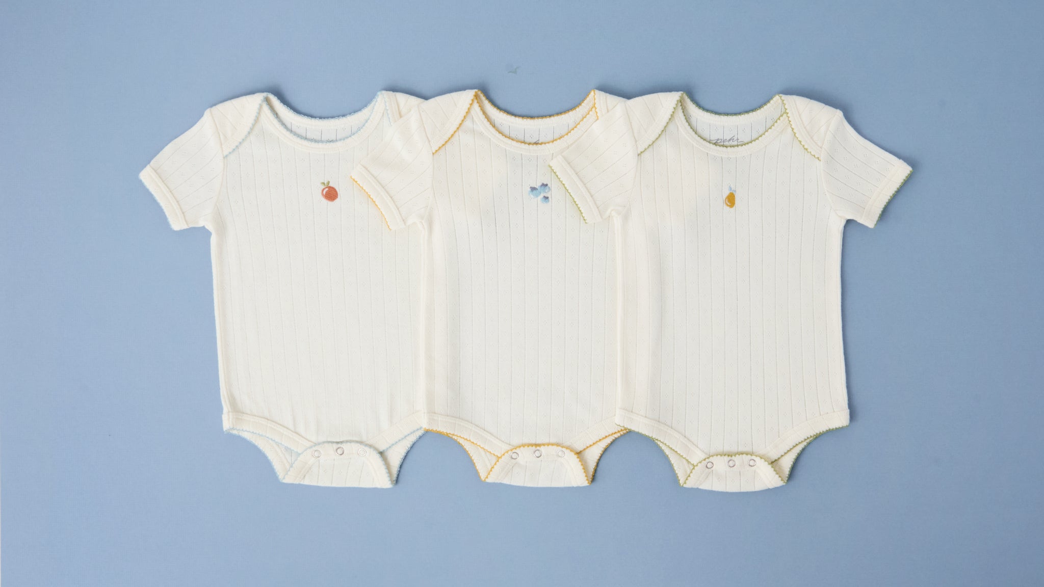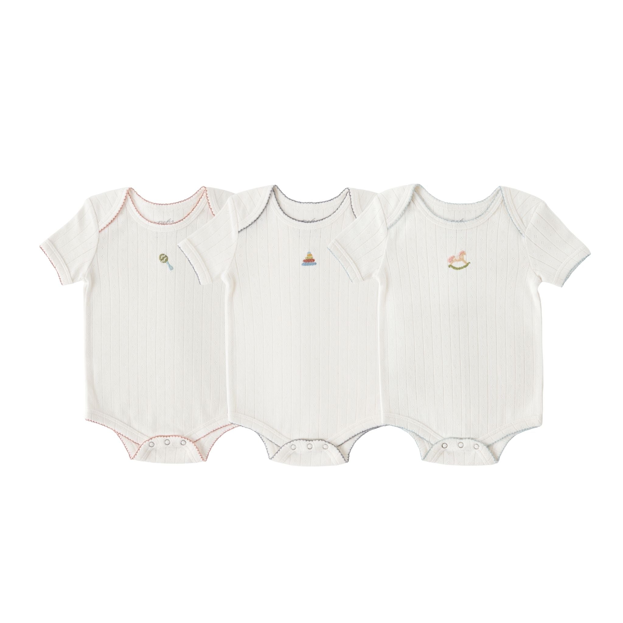 • 3-pack baby one-piece set, embroidered by theme with a gender-neutral palette