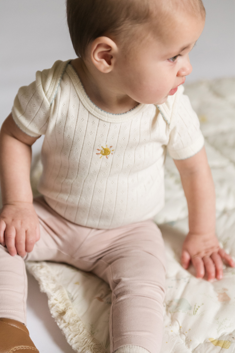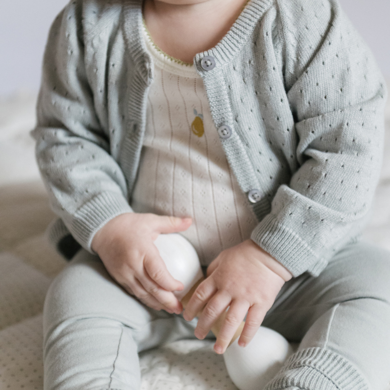 Made from 100% GOTS-certified organic cotton pointelle, this breathable rib knit is lightweight, gentle, and comfortable for sensitive newborn skin.