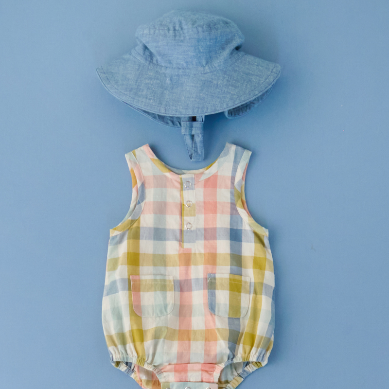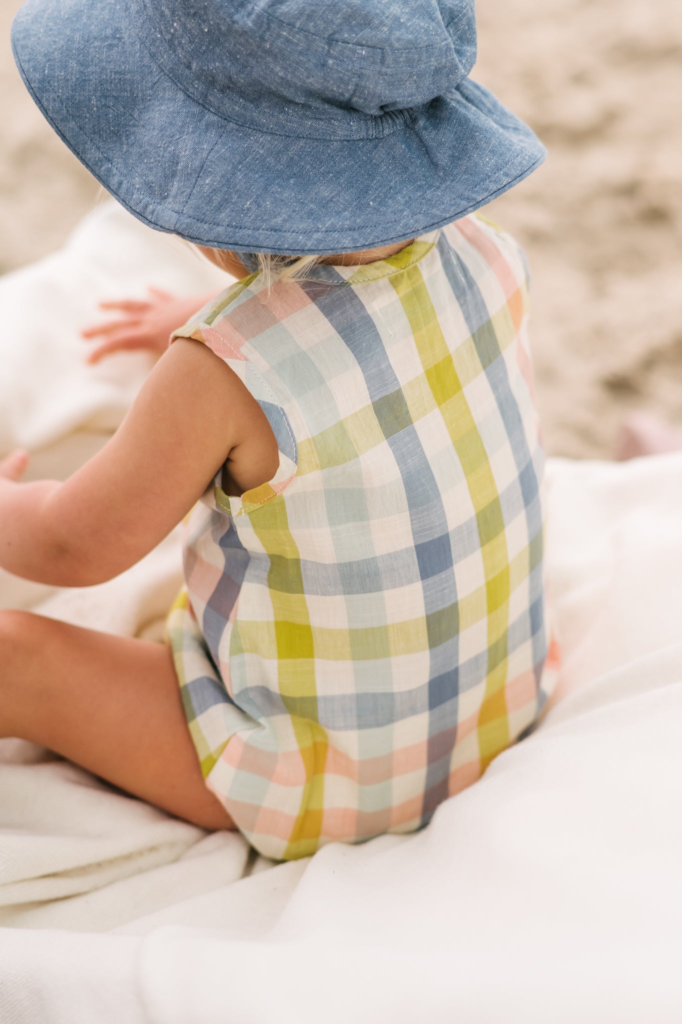 A summertime staple made for play. Whether for a backyard picnic or a trip to the beach, our Checkmate Pocket One-Piece offers a relaxed, comfy, billowy fit. This sleeveless Henley style is crafted from GOTS certified 100% woven organic cotton that's soft and breathable. Front and bottom snaps make for easy changes, while patch pockets and a bubble silhouette add a playful finish. Pehr it with our Checkmate Bucket Hat to match head to toe.