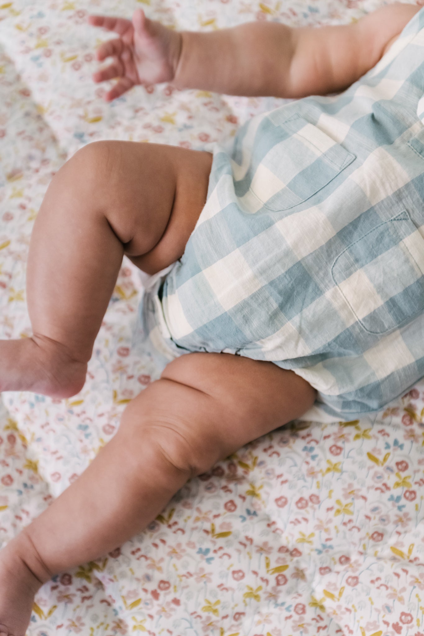 Crafted from GOTS certified 100% woven organic cotton, this lightweight one-piece is soft, breathable, and gentle on little skin.