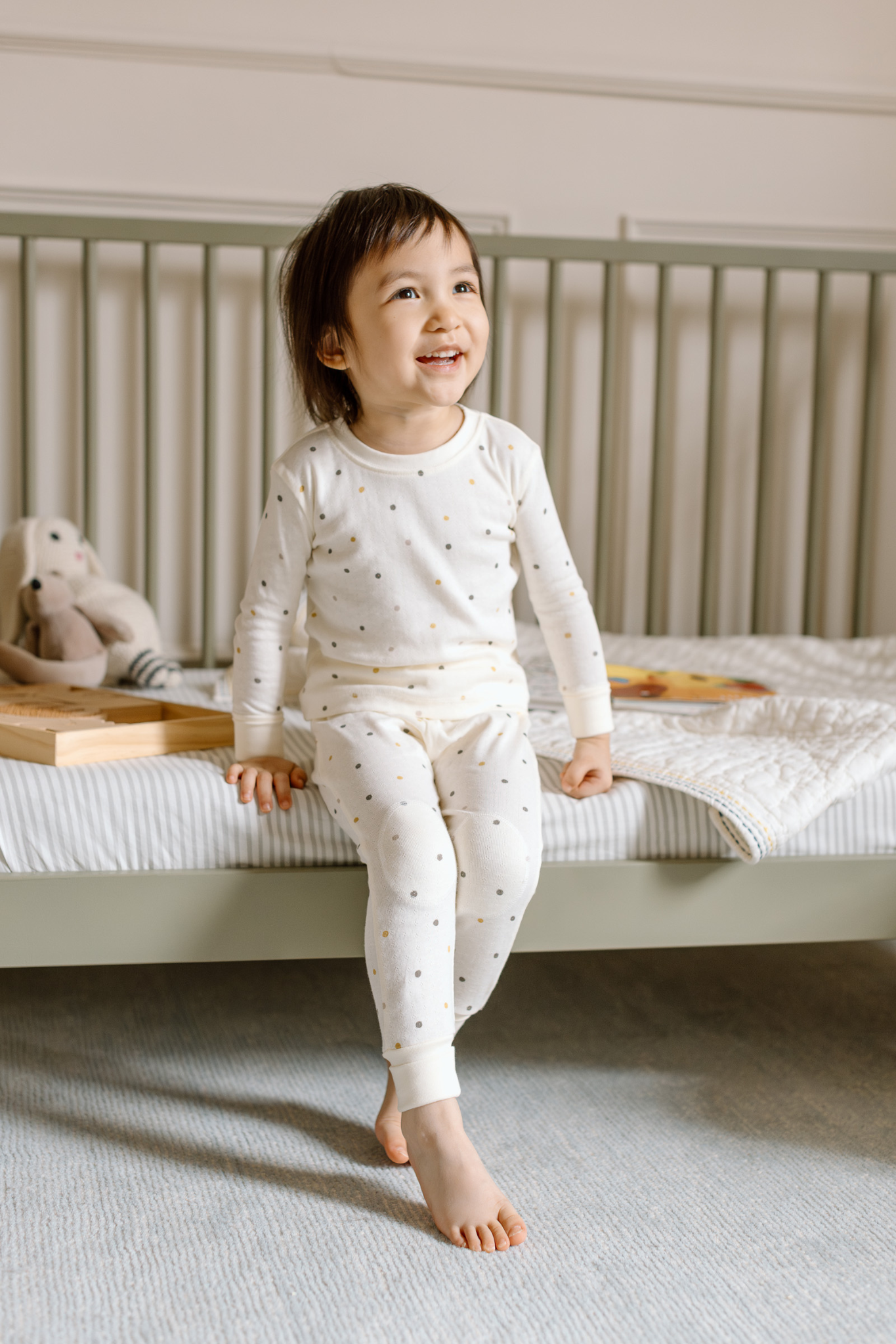 Soft, sweet, and made for comfy nights. Our Pointelle Toddler Pajama is crafted from the softest GOTS certified organic cotton with a breathable pointelle rib. Designed to grow with your little one, it features foldable “grow with me” cuffs at the wrists and ankles, plus reinforced knee patches for extra durability during play. Lightweight and cozy, it’s perfect for warm sleepers or easy layering, with an all-over neutral dot print to bring on the sweetest dreams.