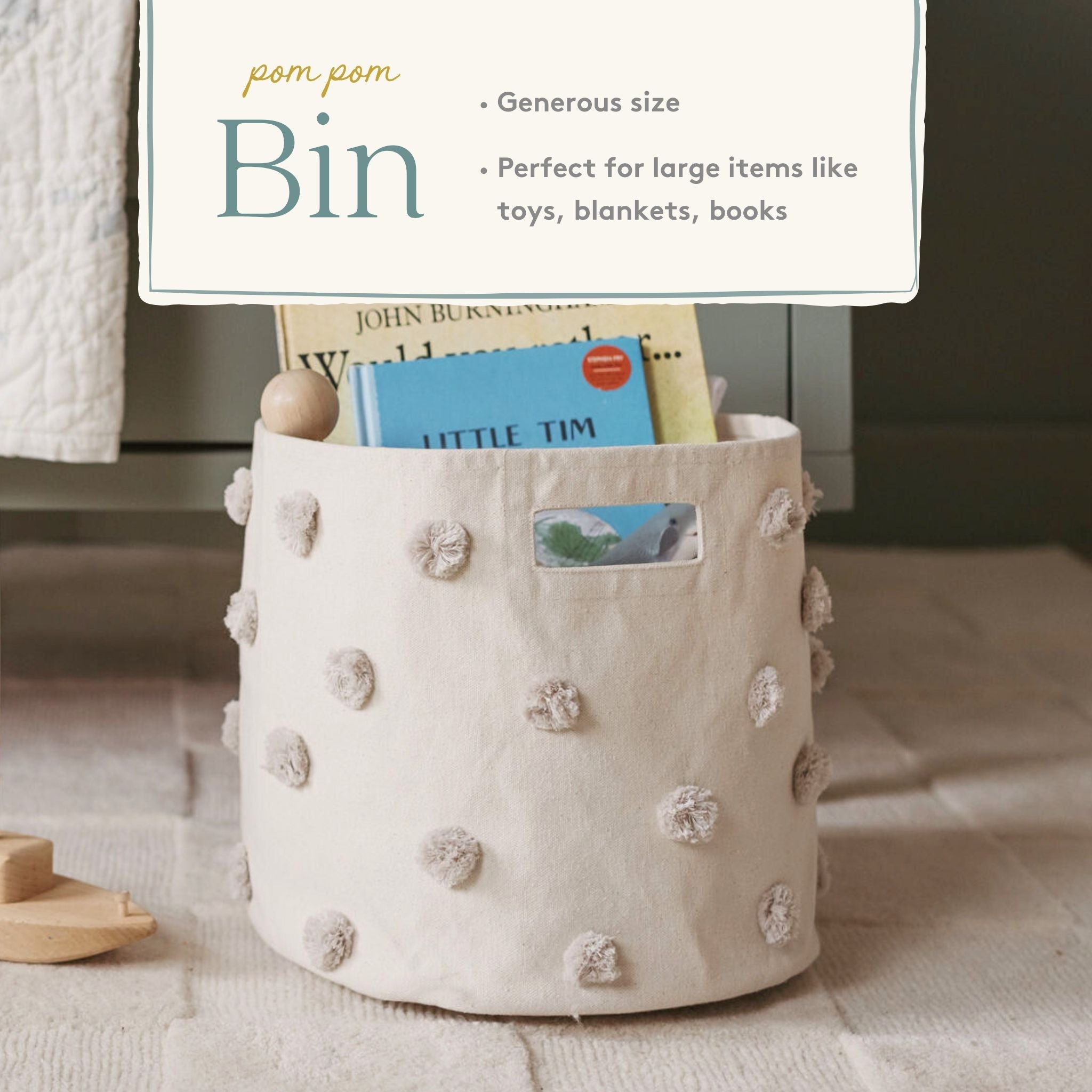 Tidy away books, trains and craft supplies. Great for your little one's treasures or as a catch all for the family. With each Pom Pom sewn by hand, our Pom Pom Bin is parent approved and a fan favorite.
