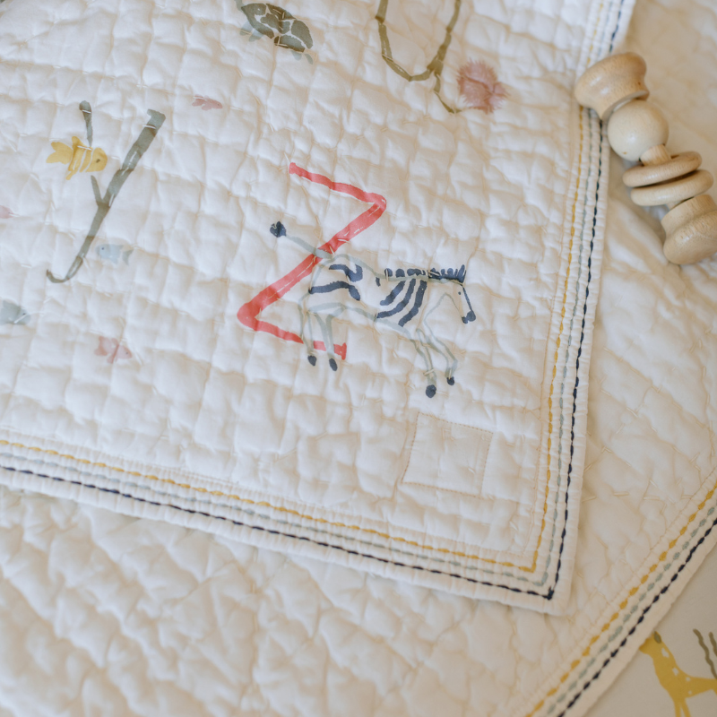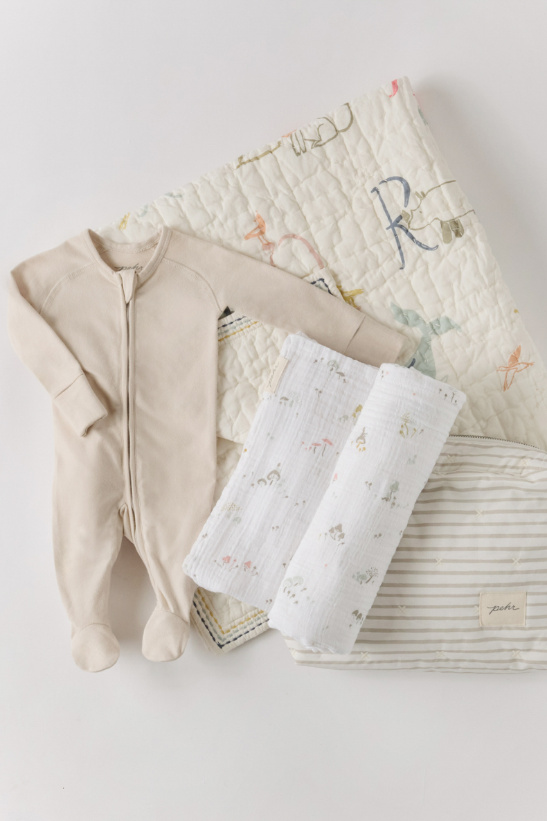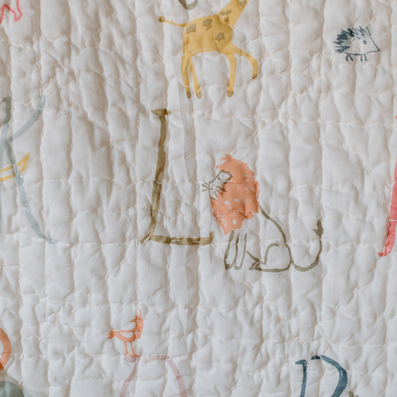 From playtime to naptime, our A to Zoo Blanket is designed to surround your little one in softness and charm. Made from 100% cotton, it features heirloom-inspired quilt stitching, delicate piping along the seams, and a whimsical print on each side for endless versatility. Thoughtfully crafted with quality that lasts, it’s a cozy keepsake that “Pehrs” perfectly with the matching One-Piece.