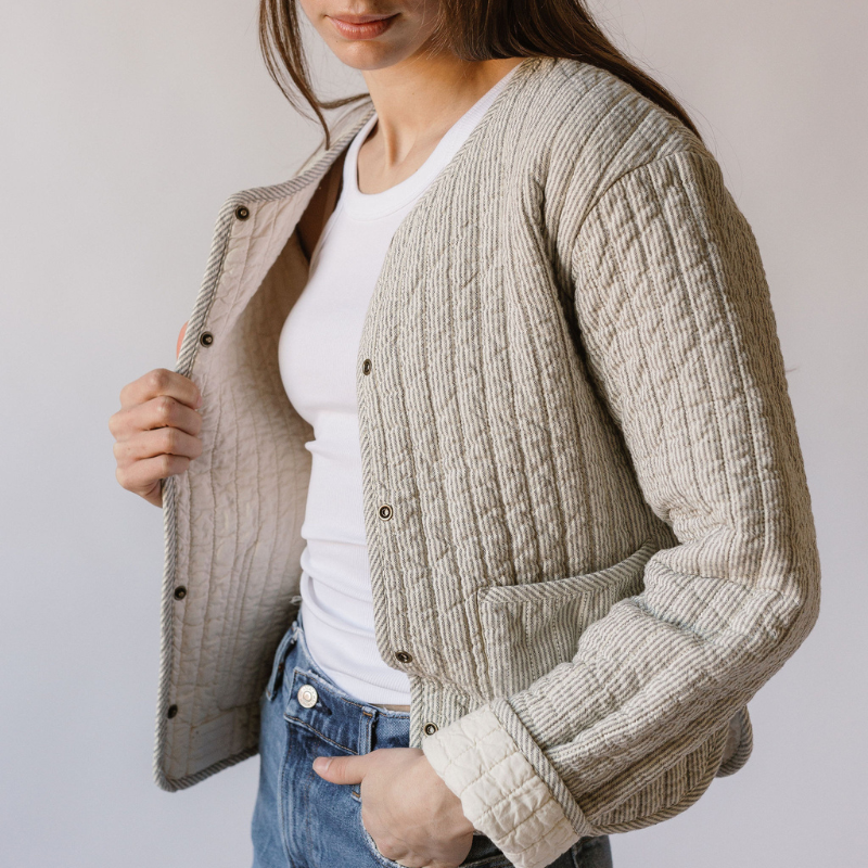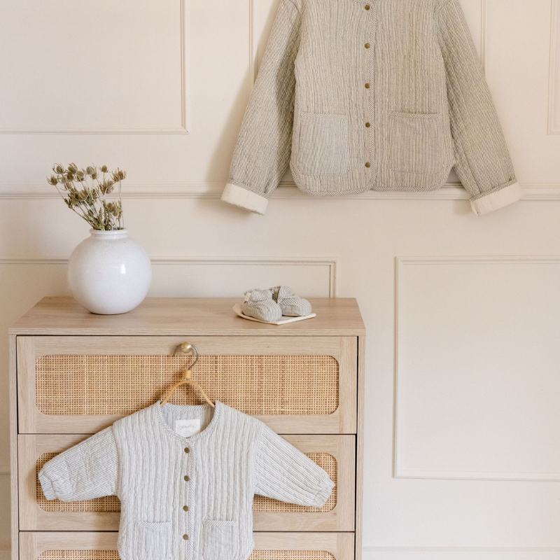 Match with your mini in the Women’s Quilted Jacket. Crafted from GOTS certified organic cotton in our signature woven railway stripe, this lightweight layer is made for everyday ease. With front patch pockets, a clean placket, and a relaxed fit, it’s a go-to piece you’ll reach for again and again. Pehr with your little one’s Railroad Quilted Jacket for the cutest coordinated look.