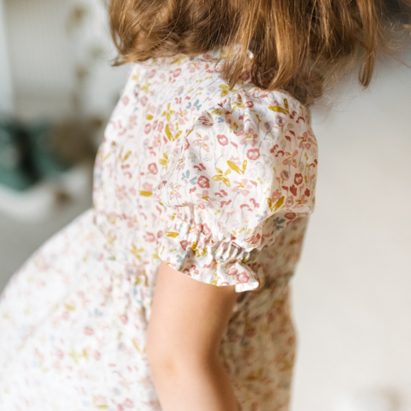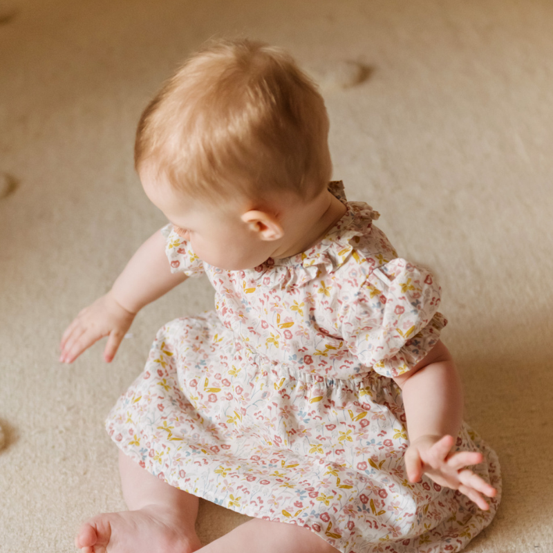 As dreamy as a garden in bloom. With a classic ruffled collar, playful puff sleeves, and hidden pockets for tiny treasures, the Floret Dress is perfect for everything from playdates to picture days. Made from lightweight 100% GOTS-certified organic cotton, it’s fully lined for comfort and features an elastic waist and back snap opening for easy dressing. Pehr it with our matching Bloomers for babies or Flats and Sandals for Toddlers.