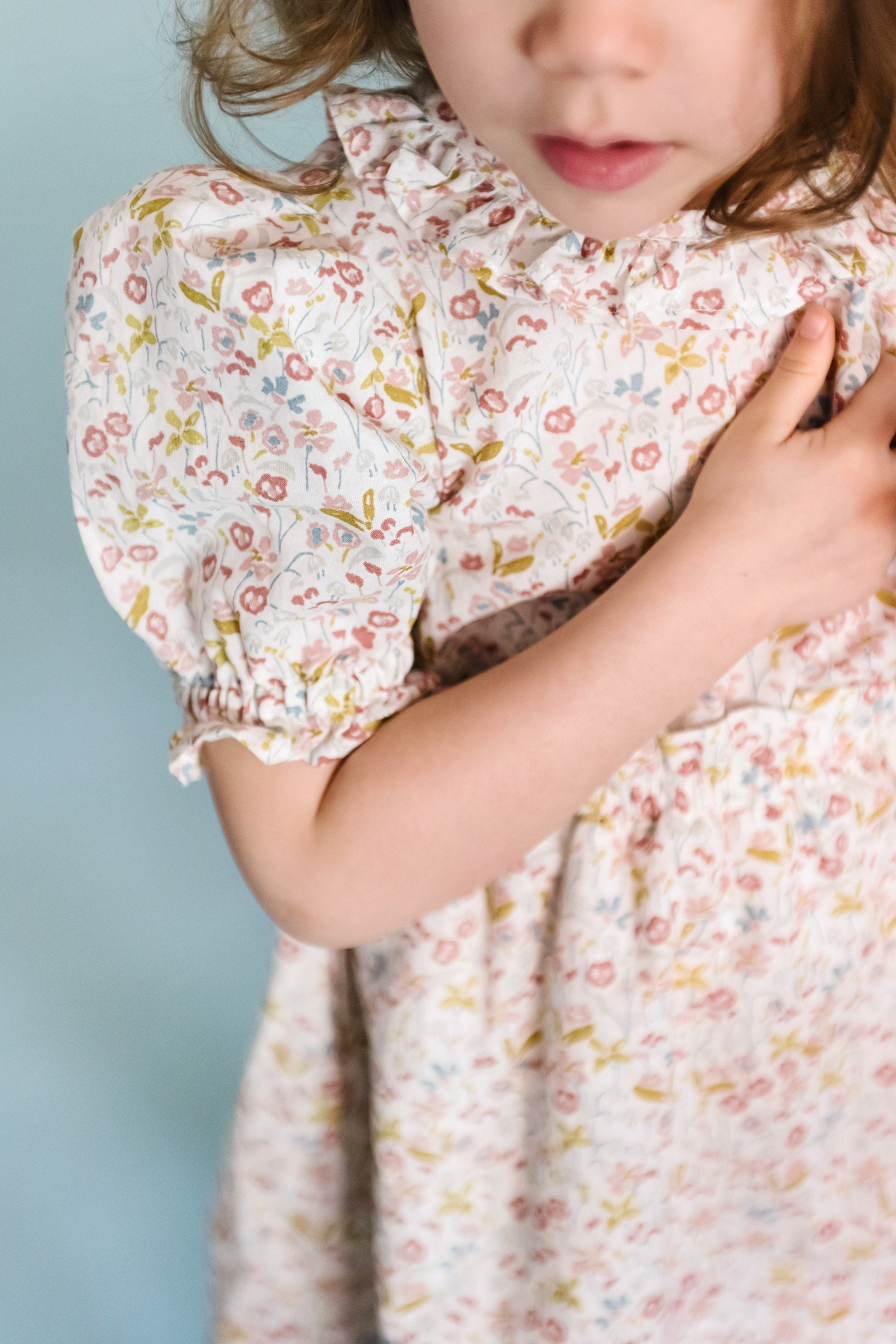 As dreamy as a garden in bloom. With a classic ruffled collar, playful puff sleeves, and hidden pockets for tiny treasures, the Floret Dress is perfect for everything from playdates to picture days. Made from lightweight 100% GOTS-certified organic cotton, it’s fully lined for comfort and features an elastic waist and back snap opening for easy dressing. Pehr it with our matching Bloomers for babies or Flats and Sandals for Toddlers.