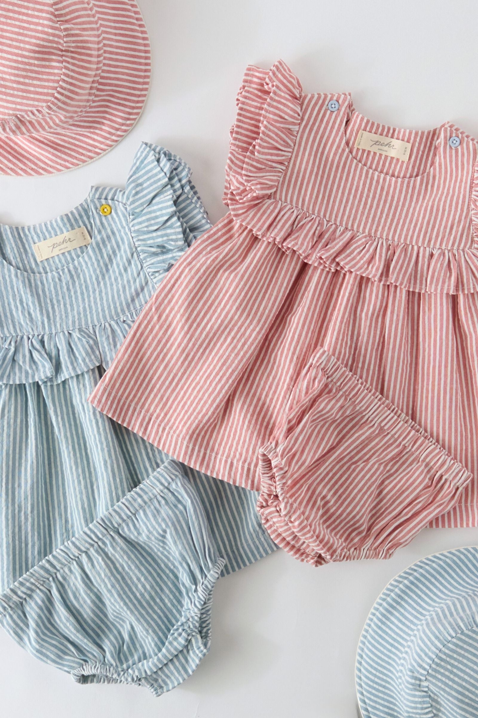 Easy, breezy and irresistibly cute, our Seersucker Bloomer is a warm-weather staple. Designed to be worn with matching One-Pieces, Bucket Hat or Dresses, they complete outfits as a lightweight bottom for little ones. Made from GOTS certified 100% organic cotton, they have a puckered seersucker texture, elastic waist and legs and a billowy silhouette that’s both comfy and cute.