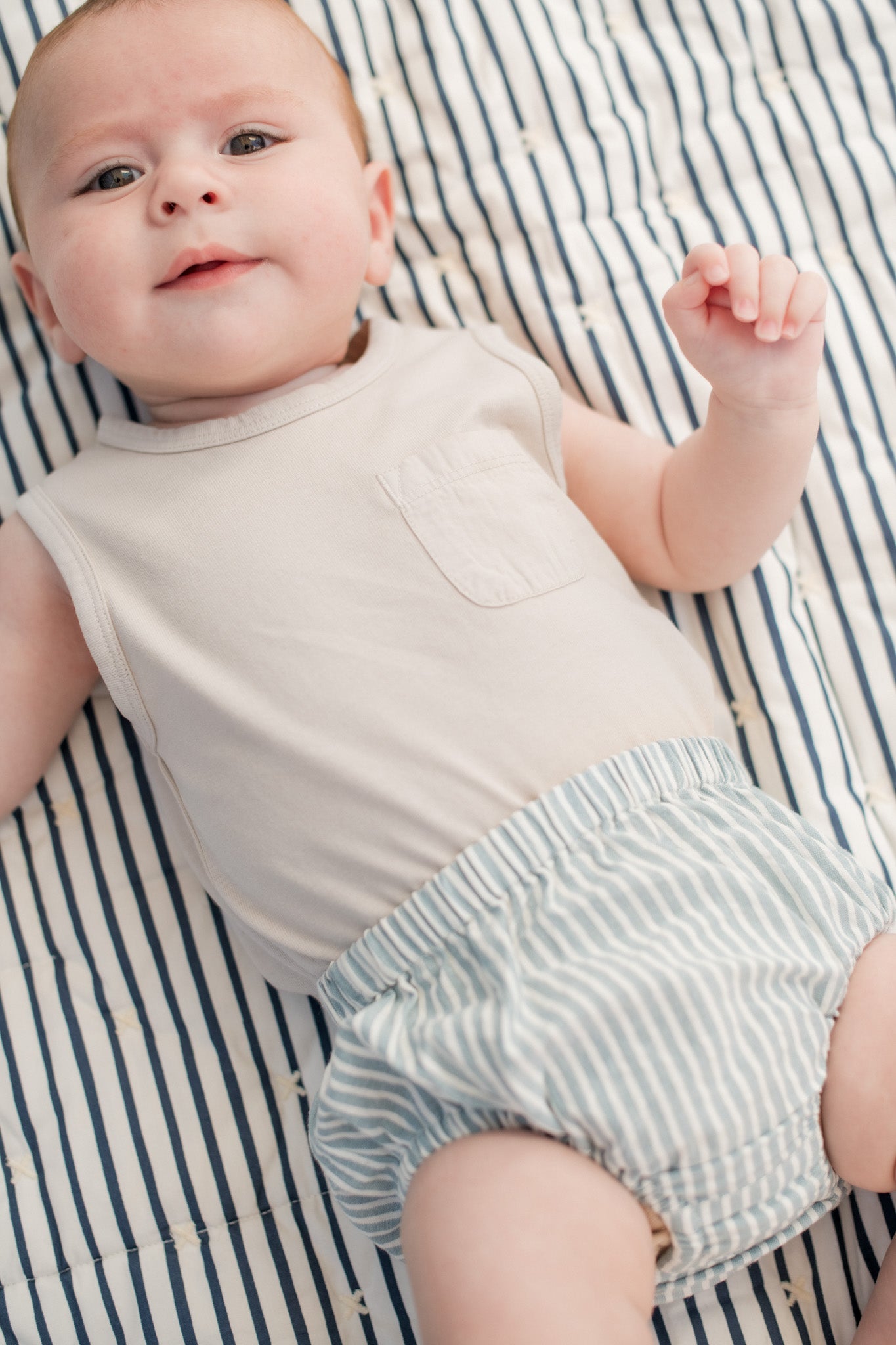 Easy, breezy and irresistibly cute, our Seersucker Bloomer is a warm-weather staple. Designed to be worn with matching One-Pieces, Bucket Hat or Dresses, they complete outfits as a lightweight bottom for little ones. Made from GOTS certified 100% organic cotton, they have a puckered seersucker texture, elastic waist and legs and a billowy silhouette that’s both comfy and cute.
