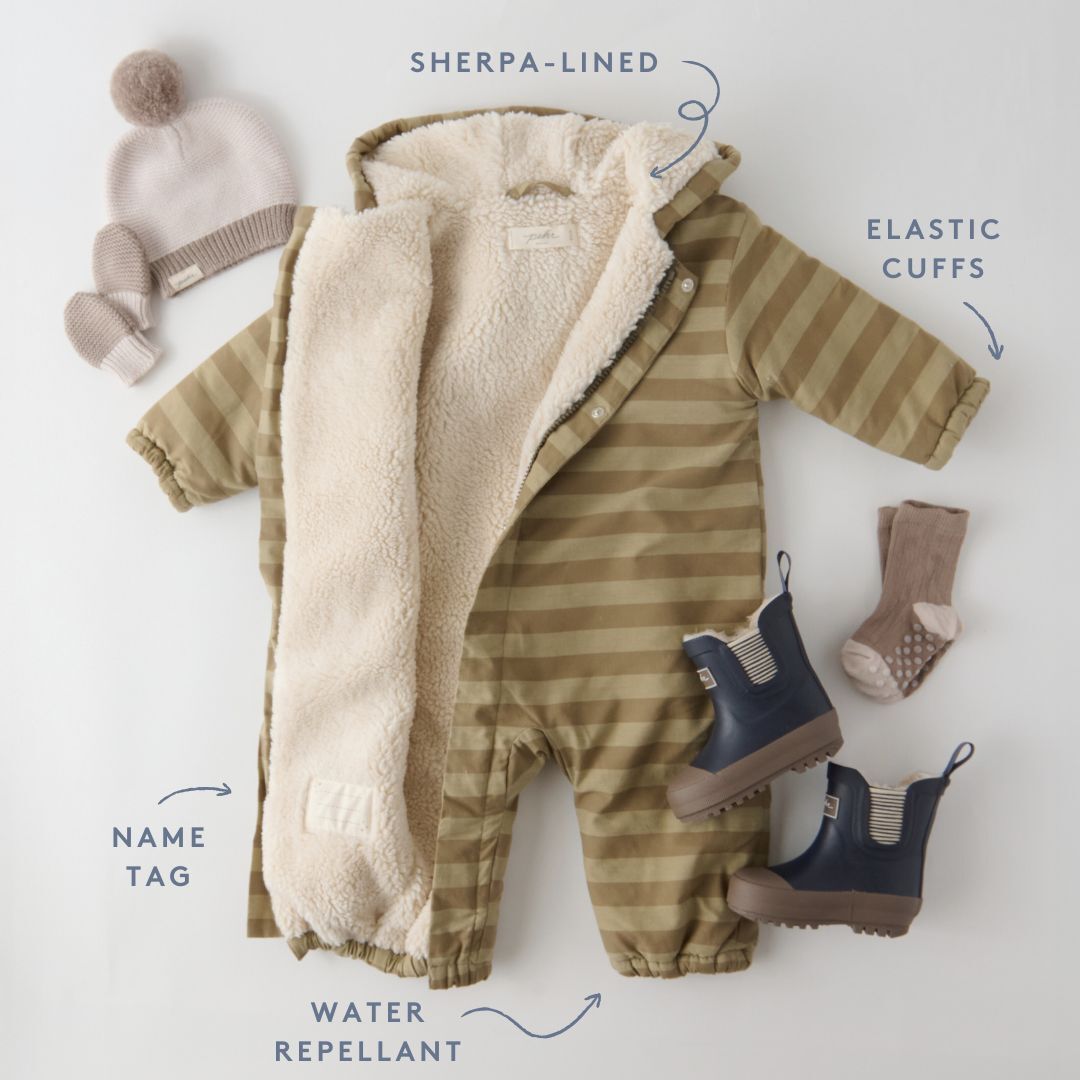 Keep baby cozy with our Sherpa Lined Storm Splash Suit. Made with a water-repellent, non-toxic coated shell and fully lined in soft sherpa, it’s the perfect blend of warmth and comfort. Thoughtful details like elasticized cuffs, a removable front zipper with hidden snaps, and an interior name tag make dressing easy and worry-free for parents on the go. Pehr with our Pathfinder boots for a splash safe look.