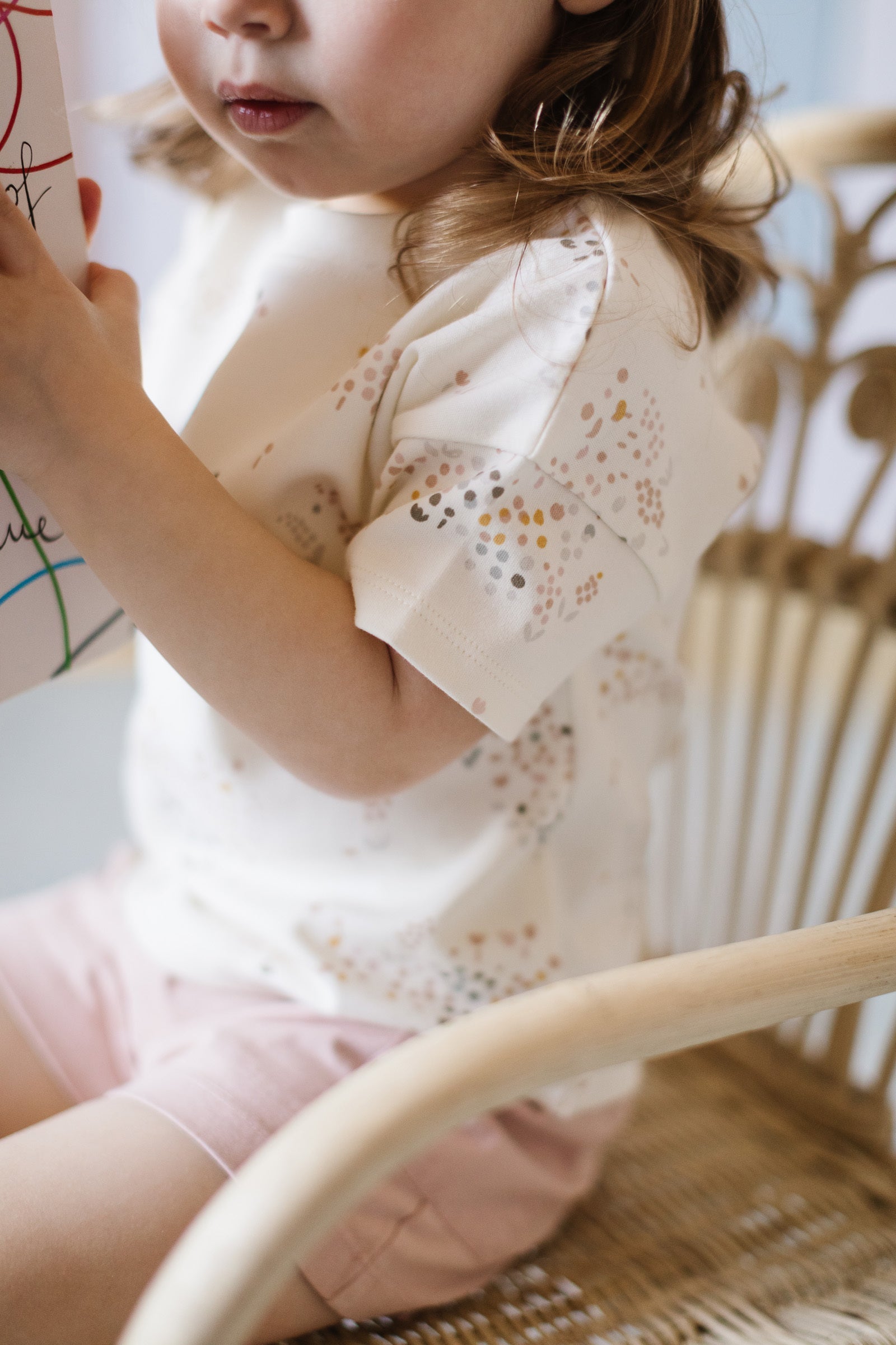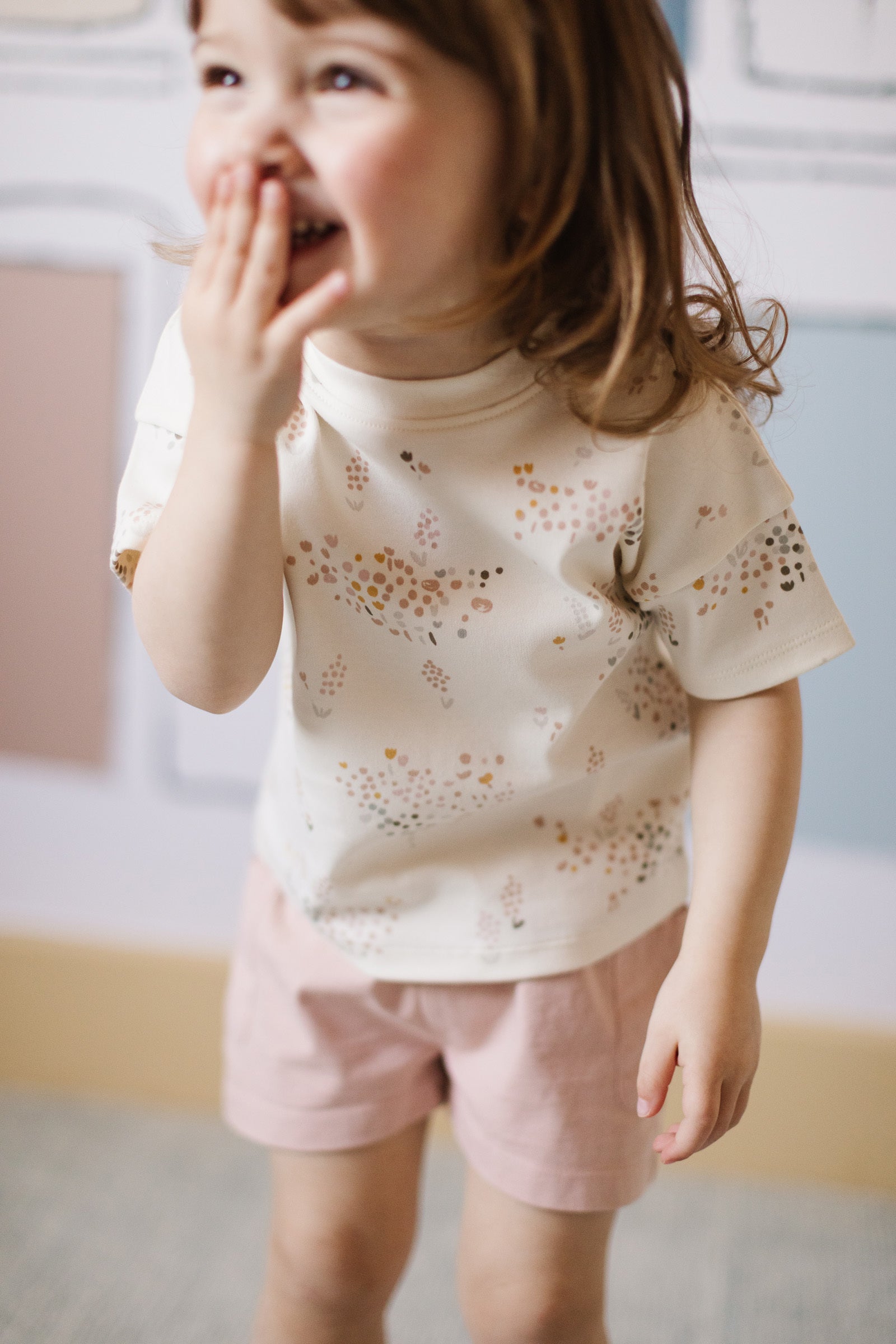 The relaxed, boxy silhouette and drop shoulder design give your little one room to move, explore, and play.