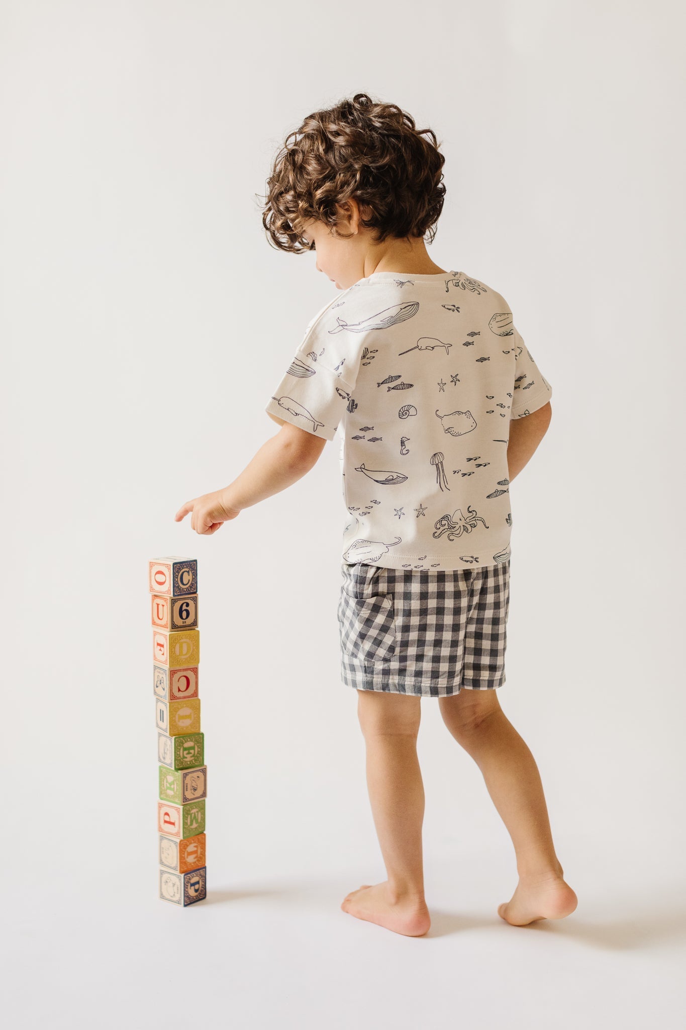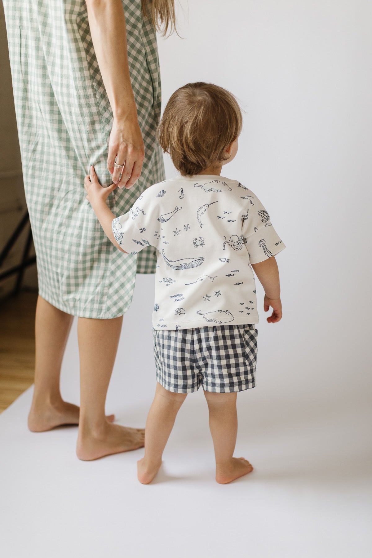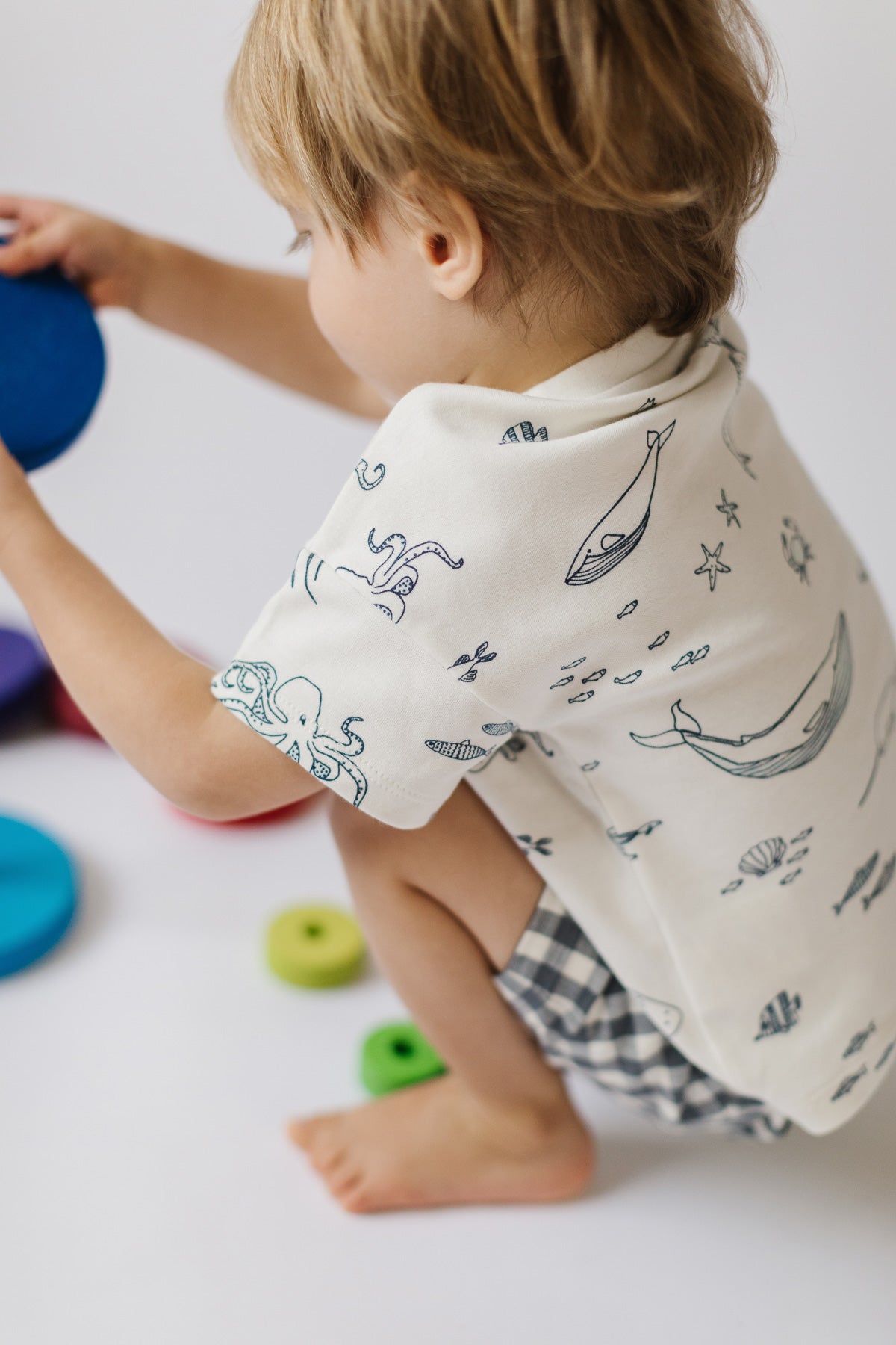 The relaxed, boxy silhouette and drop shoulder design give your little one room to move, explore, and play.