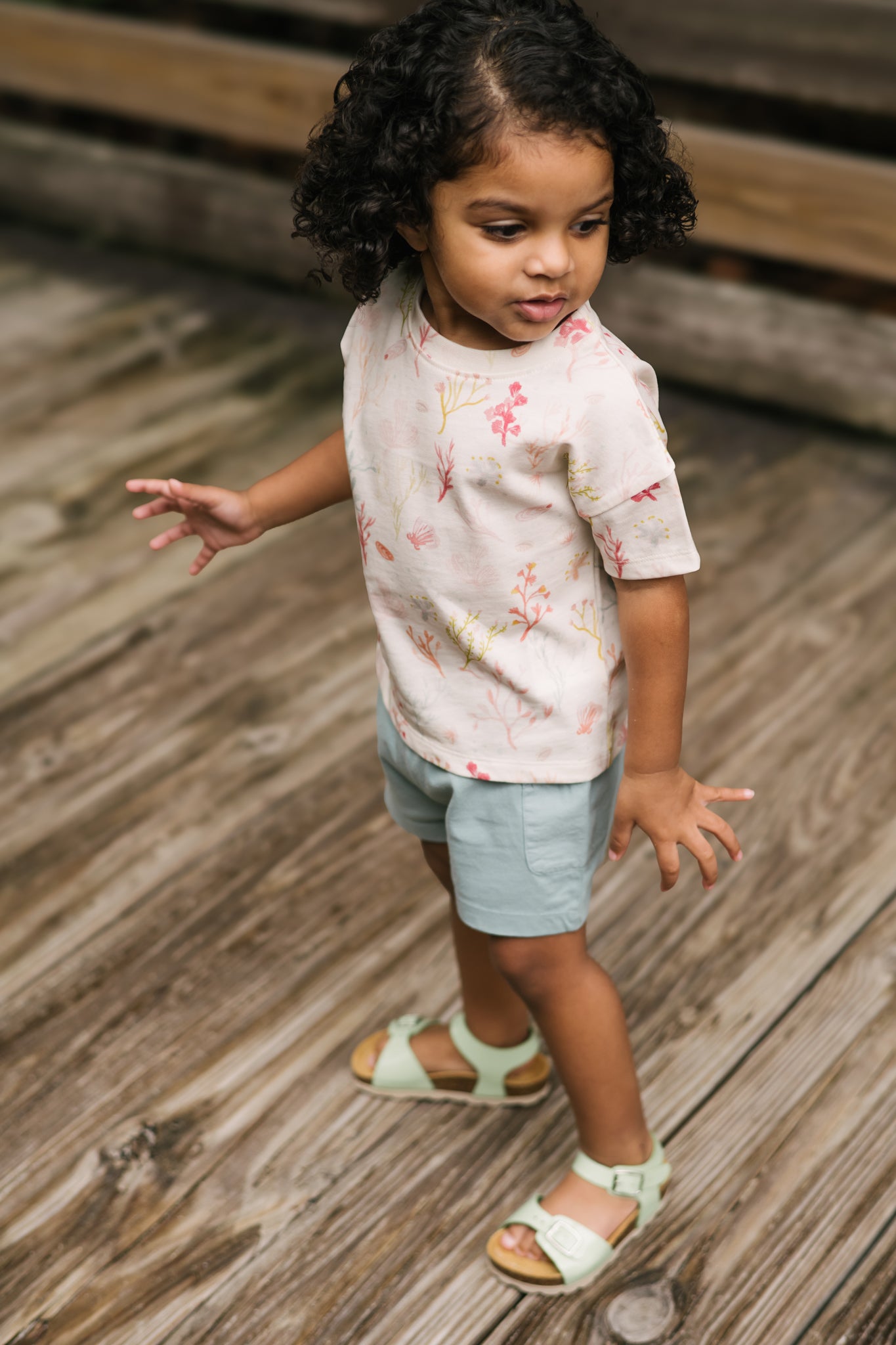 The relaxed, boxy silhouette and drop shoulder design give your little one room to move, explore, and play.